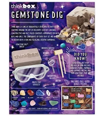 Dig into the exciting world of gemology with the Think box Gemstone Dig STEM kit! Strap on your safety goggles and walk in the footsteps of real geologist and gemologist as you use excavation tools, like a mallet and chisel, to dig through a stone and find real hidden gems — from turquoise to amethyst. Sweep away any excess dig particles with the included brush and identify each of your findings with the bonus poster! Then, perform streak tests to determine the hardness of every gemstone you find — which do you think will leave the most distinctive mark? The Think box Gemstone Dig kit is the perfect way for lovers of all-things-science to immerse themselves in a fun, hands-on learning experience that will spark their curiosity in the natural world and the gemstones inside it!