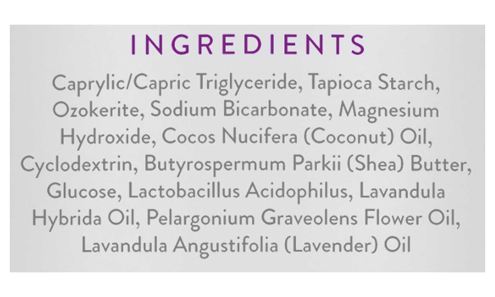 Ingredients: Caprylic/Capric Triglyceride, Tapioca Starch, Ozokerite, Sodium Bicarbonate, Magnesium Hydroxide, Cocos Nucifera (Coconut) Oil, Cyclodextrin, Butyrospermum Parkii (Shea) Butter, Glucose, Lactobacillus Acidophilus, Lavandula Hybrida Oil, Pelargonium Graveolens Flower Oil, Lavandula Angustifolia (Lavender) Oil Contains: Tree Nuts