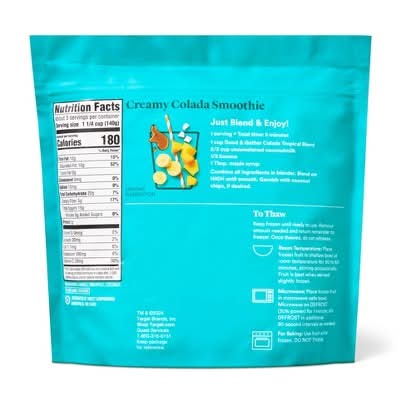 Frozen Colada Tropical Blend from Good & Gather™ is a great way to add a touch of the tropics to smoothies, parfaits and more. This frozen fruit mix is a delicious combo of juicy chunks of mango and pineapple and coconut pieces. The blend has 0 grams of added sugar - Not a low calorie food. See nutrition information for calorie and sugar content - letting the sweetness of the fruit stand out on its own. This fruit blend is a great and tasty way to get an excellent source of vitamin C - see nutrition information for fat and saturated fat content - whether you're whipping up a fruity smoothie, topping off a dish of vanilla frozen yogurt or making a fruity tropical punch.To Thaw Keep frozen until ready to use. Remove amount needed and return remainder to freezer. Once thawed, do not refreeze.Room TemperaturePlace frozen fruit in shallow bowl at room temperature for 30 to 60 minutes, stirring occasionally. Fruit is best when served slightly frozen.MicrowavePlace frozen fruit in microwave-safe bowl. Microwave on DEFROST (30% power) for 1 minute; stir. DEFROST in additional 30-second intervals as needed.For bakingUse fruit while frozen. DO NOT THAW. Every product that carries the Good & Gather™ name starts with quality ingredients that deliver great taste, making it easier for you and your family to eat well, every day. We promise you’ll love each bite, or your money back. All Good & Gather products are made without artificial flavors, synthetic colors, artificial sweeteners, and high-fructose corn syrup. Some are specially formulated while others never contained these ingredients.