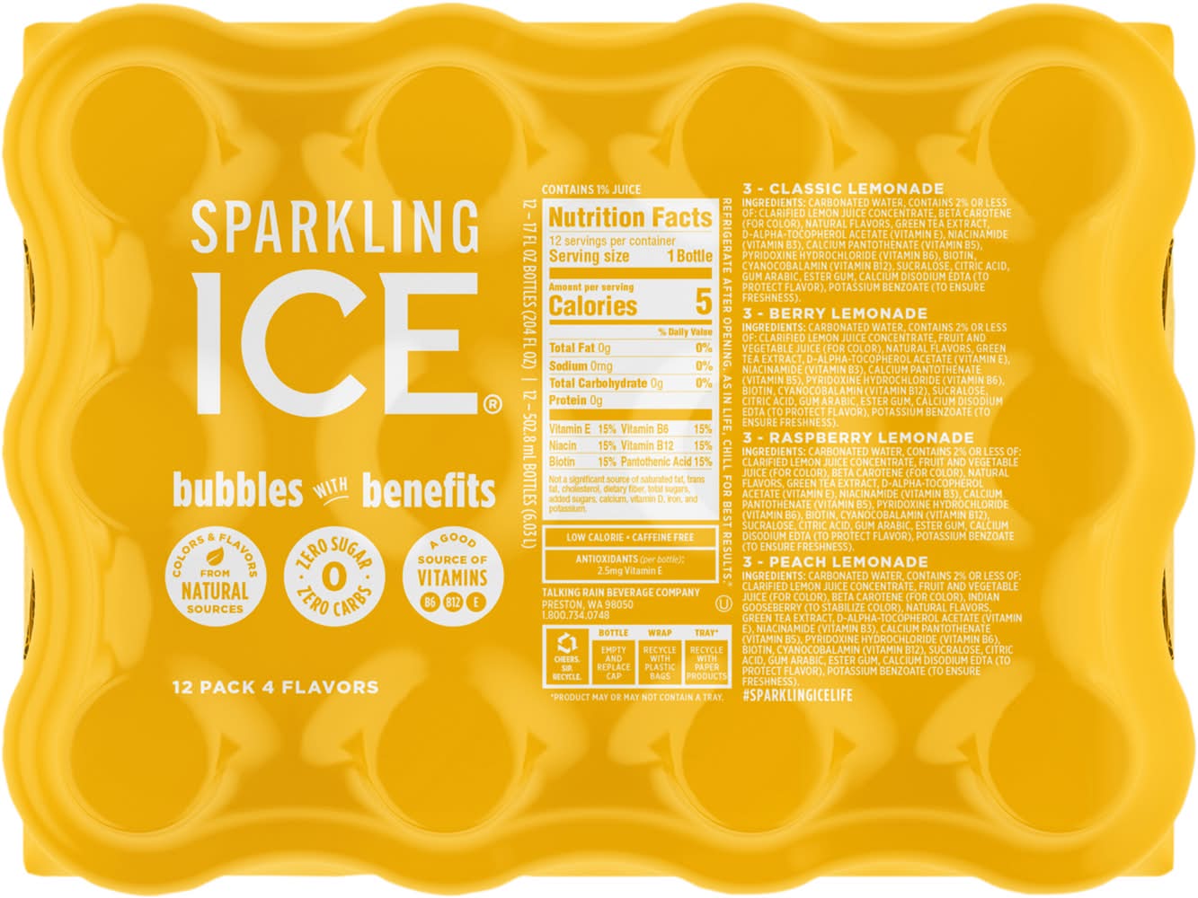 Ingredients: Classic Lemonade: Carbonated Water, Contains 2% or Less of: Clarified Lemon Juice Concentrate, Beta Carotene (for Color), Natural Flavors, Green Tea Extract, D-Alpha-Tocopherol Acetate (Vitamin E), Niacinamide (Vitamin B3), Calcium Pantothenate (Vitamin B5), Pyridoxine Hydrochloride (Vitamin B6), Biotin, Cyanocobalamin (Vitamin B12), Sucralose, Citric Acid, Gum Arabic, Ester Gum, Calcium Disodium EDTA (to Protect Flavor), Potassium Benzoate (to Ensure Freshness). Berry Lemonade: Carbonated Water, Contains 2% or Less of: Clarified Lemon Juice Concentrate, Fruit and Vegetable Juice (for Color), Natural Flavors, Green Tea Extract, D-Alpha-Tocopherol Acetate (Vitamin E), Niacinamide (Vitamin B3), Calcium Pantothenate (Vitamin B5), Pyridoxine Hydrochloride (Vitamin B6), Biotin, Cyanocobalamin (Vitamin B12), Sucralose, Citric Acid, Gum Arabic, Ester Gum, Calcium Disodium EDTA (to Protect Flavor), Potassium Benzoate (to Ensure Freshness). Raspberry Lemonade: Carbonated Water, Contains 2% or Less of: Clarified Lemon Juice Concentrate, Fruit and Vegetable Juice (for Color), Beta Carotene (for Color), Natural Flavors, Green Tea Extract, D-Alpha-Tocopherol Acetate (Vitamin E), Niacinamide (Vitamin B3), Calcium Pantothenate (Vitamin B5), Pyridoxine Hydrochloride (Vitamin B6), Biotin, Cyanocobalamin (Vitamin B12), Sucralose, Citric Acid, Gum Arabic, Ester Gum, Calcium Disodium EDTA (to Protect Flavor), Potassium Benzoate (to Ensure Freshness). Peach Lemonade: Carbonated Water, Contains 2% or Less of: Clarified Lemon Juice Concentrate, Fruit and Vegetable Juice (for Color), Beta Carotene (for Color), Indian Gooseberry (to Stabilize Color), Natural Flavors, Green Tea Extract, D-Alpha-Tocopherol Acetate (Vitamin E), Niacinamide (Vitamin B3), Calcium Pantothenate (Vitamin B5), Pyridoxine Hydrochloride (Vitamin B6), Biotin, Cyanocobalamin (Vitamin B12), Sucralose, Citric Acid, Gum Arabic, Ester Gum, Calcium Disodium EDTA (to Protect Flavor), Potassium Benzoate (to Ensure Freshness).