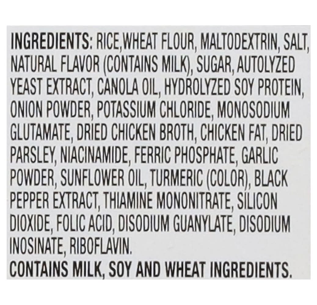Ingredients: Rice Wheat Flour Maltodextrin Salt Natural Flavor (Contains Milk) Sugar Autolyzed Yeast Extract Canola Oil Hydrolyzed Soy Protein Onion Powder Potassium Chloride, Monosodium Glutamate Dried Chicken Broth Chicken Fat Dried Parsley Niacinamide Ferric Phosphate Garlic Powder, Sunflower Oil Turmeric (Color) Black Pepper Extract Thiamine Mononitrate Silicon Dioxide Folic Acid Disodium Guanylate Disodium Inosinate Riboflavin Contains: Milk, Soybeans, Wheat