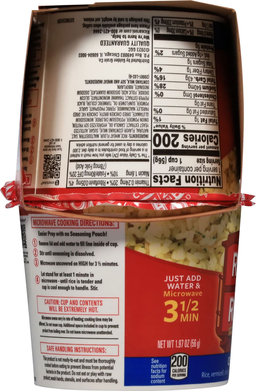 Safe handling instructions: this product is not ready-to-eat and must be thoroughly cooked before eating to prevent illness from potential bacteria in the product. do not eat or play with raw product; wash hands, utensils, and surfaces after handling. microwave cooking directions: easier prep with no seasoning pouch! remove lid and add water to fill line inside of cup. stir until seasoning is dissolved. microwave uncovered on high for 3 12 minutes. let stand for at least 1 minute in microwave-until rice is tender and cup is cool enough to handle. stir. caution: cup and contents will be extremely hot. microwave ovens vary in rate of heating; cooking time may be different. do not reuse cup. additional space included in cup to prevent product from boiling over. do not leave microwave unattended.