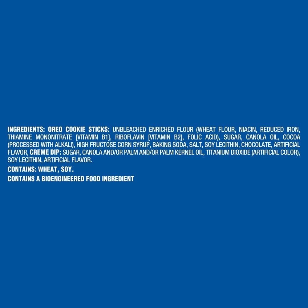 Ingredients: INGREDIENTS: OREO COOKIE STICKS: UNBLEACHED ENRICHED FLOUR (WHEAT FLOUR, NIACIN, REDUCED IRON, THIAMINE MONONITRATE [VITAMIN B1], RIBOFLAVIN [VITAMIN B2], FOLIC ACID), SUGAR, CANOLA OIL, COCOA (PROCESSED WITH ALKALI), HIGH FRUCTOSE CORN SYRUP, BAKING SODA, SALT, SOY LECITHIN, CHOCOLATE, ARTIFICIAL FLAVOR, CREME DIP: SUGAR, CANOLA AND, OR PALM AND, OR PALM KERNEL OIL, TITANIUM DIOXIDE (ARTIFICIAL COLOR), SOY LECITHIN, ARTIFICIAL FLAVOR.CONTAINS: WHEAT, SOY. Contains: CONTAINS: WHEAT, SOY.