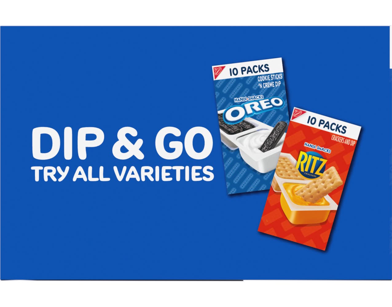 Handi-Snacks OREO Cookie Sticks 'N Creme Dip Snack Packs pair crunchy chocolate cookie sticks with rich OREO creme dip to make the perfect sweet snack. These delicious snack packs take classic OREO cookies and creme flavor and transform it into a fun, dippable treat. Toss one of these packs into your lunchbox as a tasty dessert, or stash them in your travel pack as a fun road trip treat. Each individually wrapped snack pack features handy compartments for the cookie sticks and OREO creme dip to keep everything in place, whether you're snacking at home, work, school or on the road.
