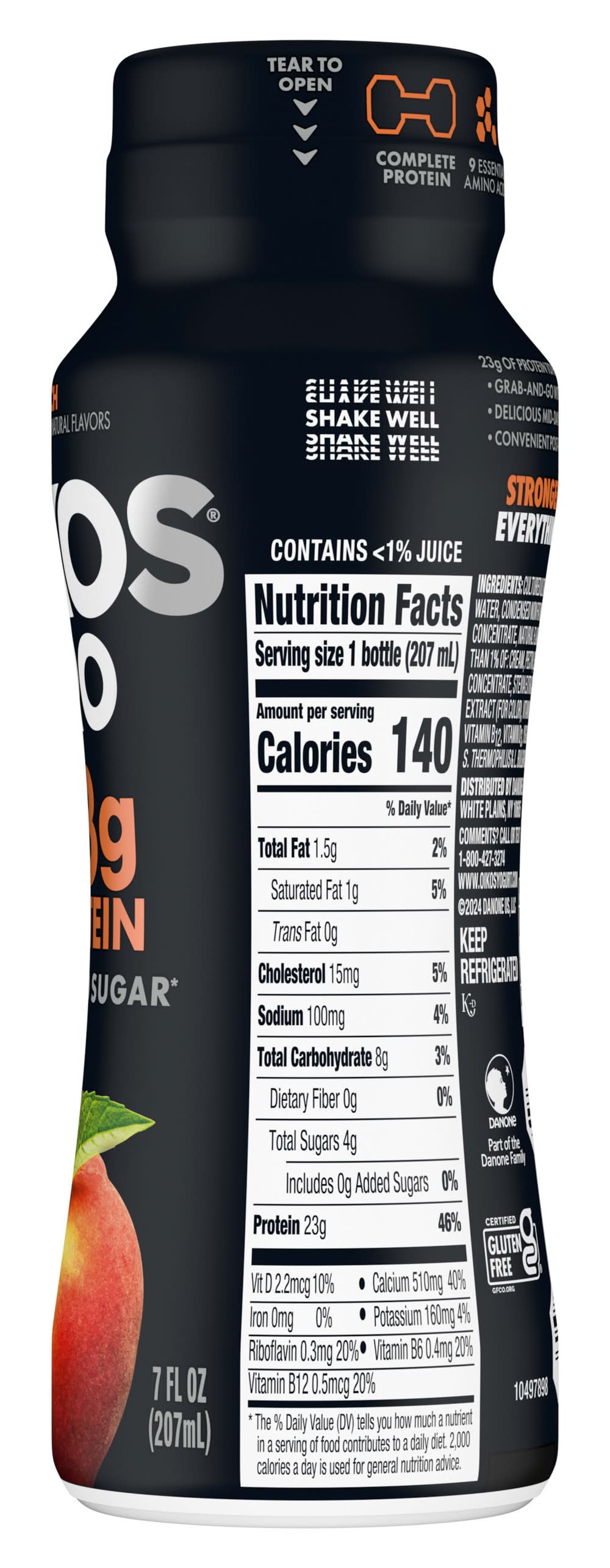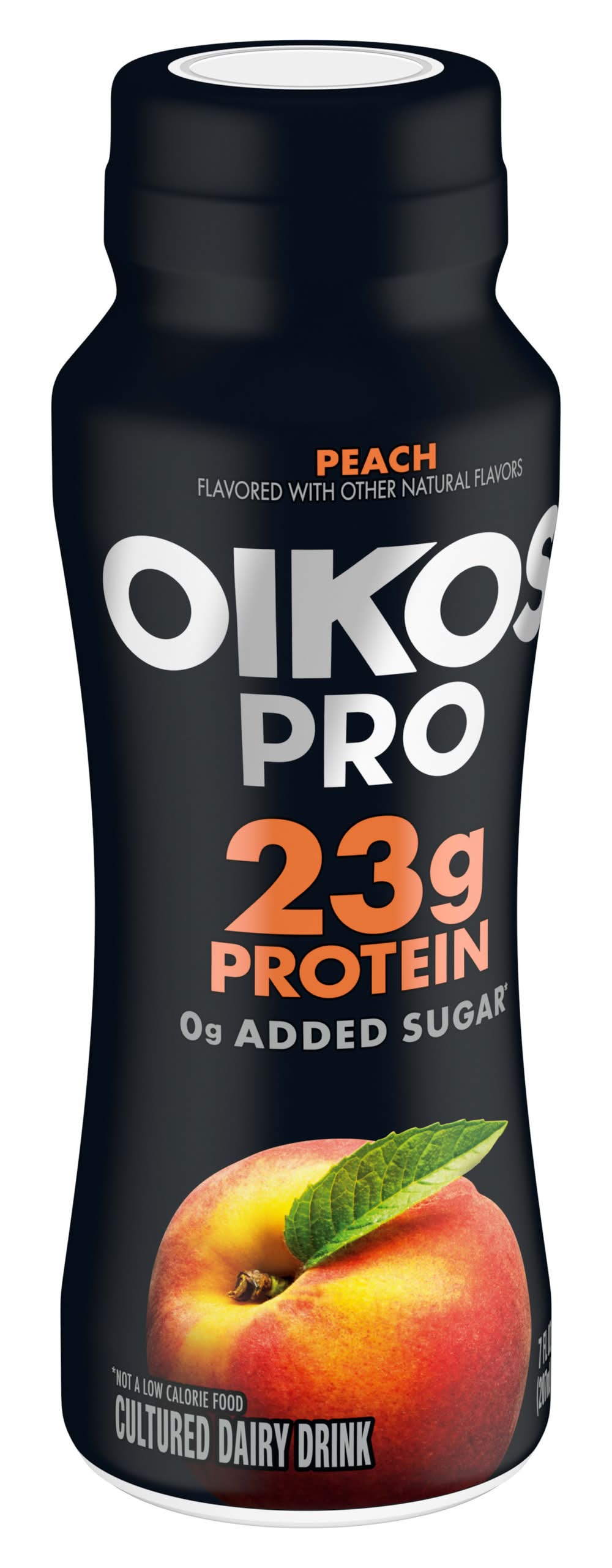 Go Pro with Oikos Pro Peach Cultured Dairy Drink, the anytime snack with more of what you want, and less of what you don’t. Every serving contains nine essential amino acids, in addition to vitamins B2, B6 and B12. There’s 0g of added sugar per serving, and no artificial sweeteners or colors from artificial sources. Our dairy beverage packs a punch with 23g of protein per serving to help support muscles, so you can always have dependable, high protein snacks to help you add more protein to your day. Because when you feel strong, you are unstoppable. With complete protein and deliciousness, these snacks can help you strive to reach your potential with every serving. Protein is important - an essential nutrient that we need in our diet - and Oikos Pro cups are great tasting, convenient solutions for adding complete protein every day. Grab these on the go snacks for days that start at a sprint, enjoy a delicious boost of protein at lunch, add a creamy boost to your protein shake, or pack a bottle for a crave-worthy post-workout snack. Plus, these cultured dairy drinks are kosher and certified gluten free. For more reasons to go Pro, Oikos Pro snack cups have you covered with 20g of protein per serving. Need 0g added sugar, 0 artificial sweeteners, and 0% fat? Try Oikos Triple Zero with 15g of protein per serving. Oikos — Stronger Makes Everything Better (R). • Flavor: Peach • Packaging: Reusable