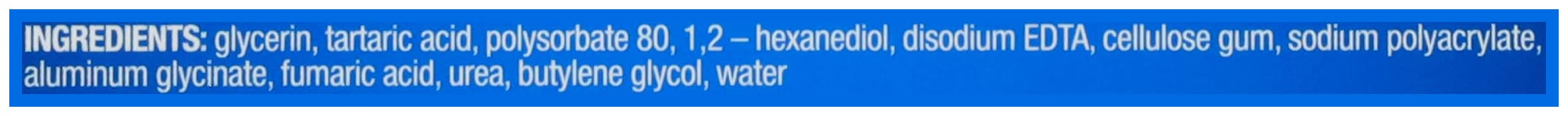 Ingredients: Glycerin, Tartaric Acid, Polysorbate 80, 1.2-Hexanediol, Disodium EDTA, Cellulose Gum, Sodium Polyacrylate, Aluminum Glycinate, Fumaric Acid, Urea, Butylene Glycol, Water