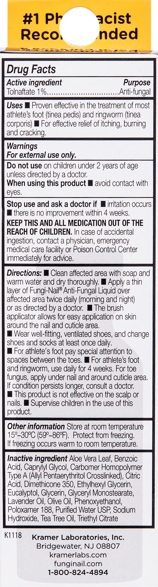 Directions: clean affected are with soap and warm water and dry thoroughly. apply a thin layer of fungi-nail anti-fungal liquid over affected area twice daily (morning and night) or as directed by a doctor. the brush applicator allows for easy application on skin around the nail and cuticle area. wear well-fitting, ventilated shoes, and change shoes and socks at least once daily. for athlete's foot pay special attention to spaces between the toes. for athlete's foot and ringworm, use daily for 4 weeks. for toe fungus, apply under nail and around cuticle area. if condition persists longer, consult a doctor. this product is not effective on the scalp or nails. supervise children in the use of this product. for best results treat around all toenails and in between toes.