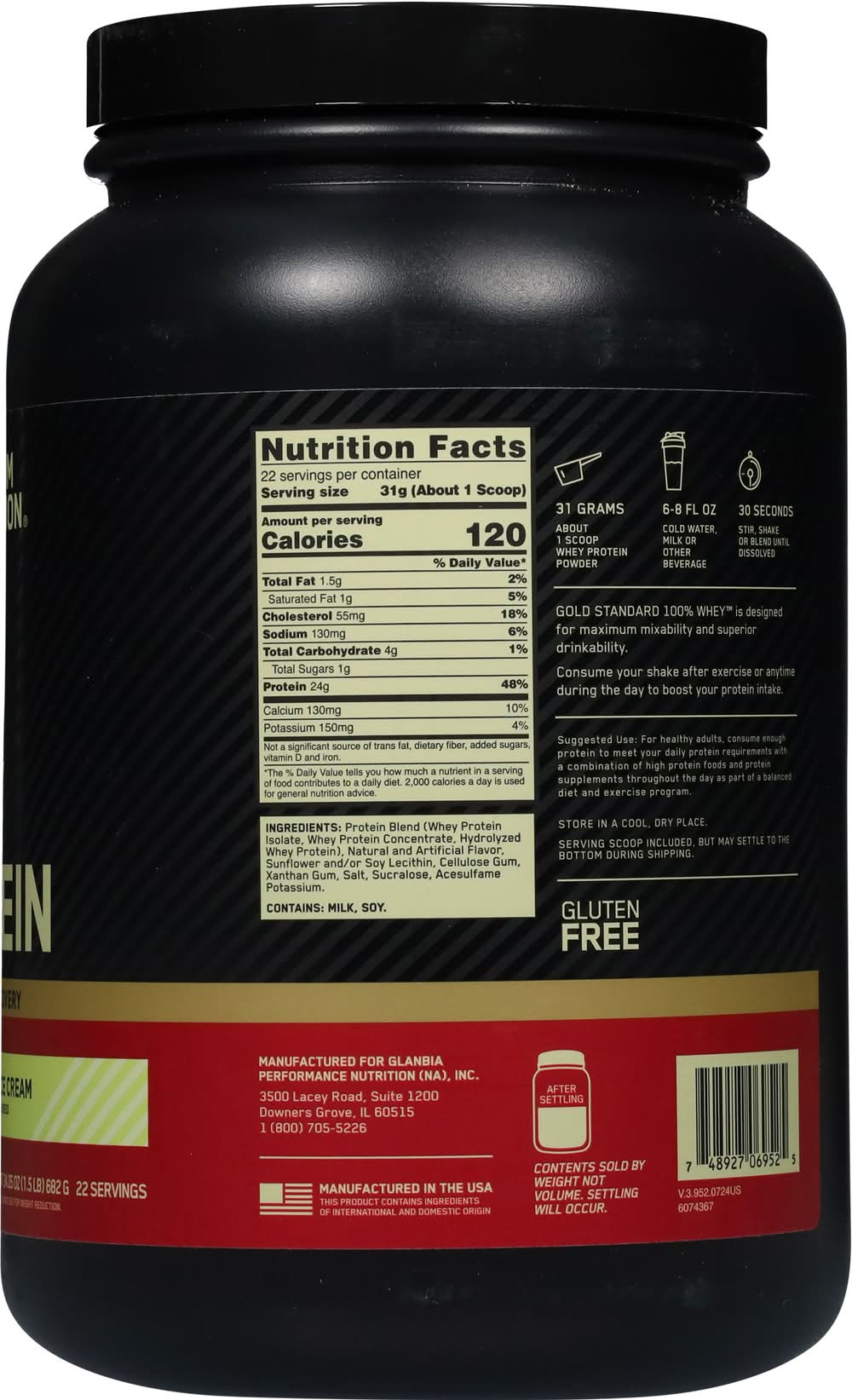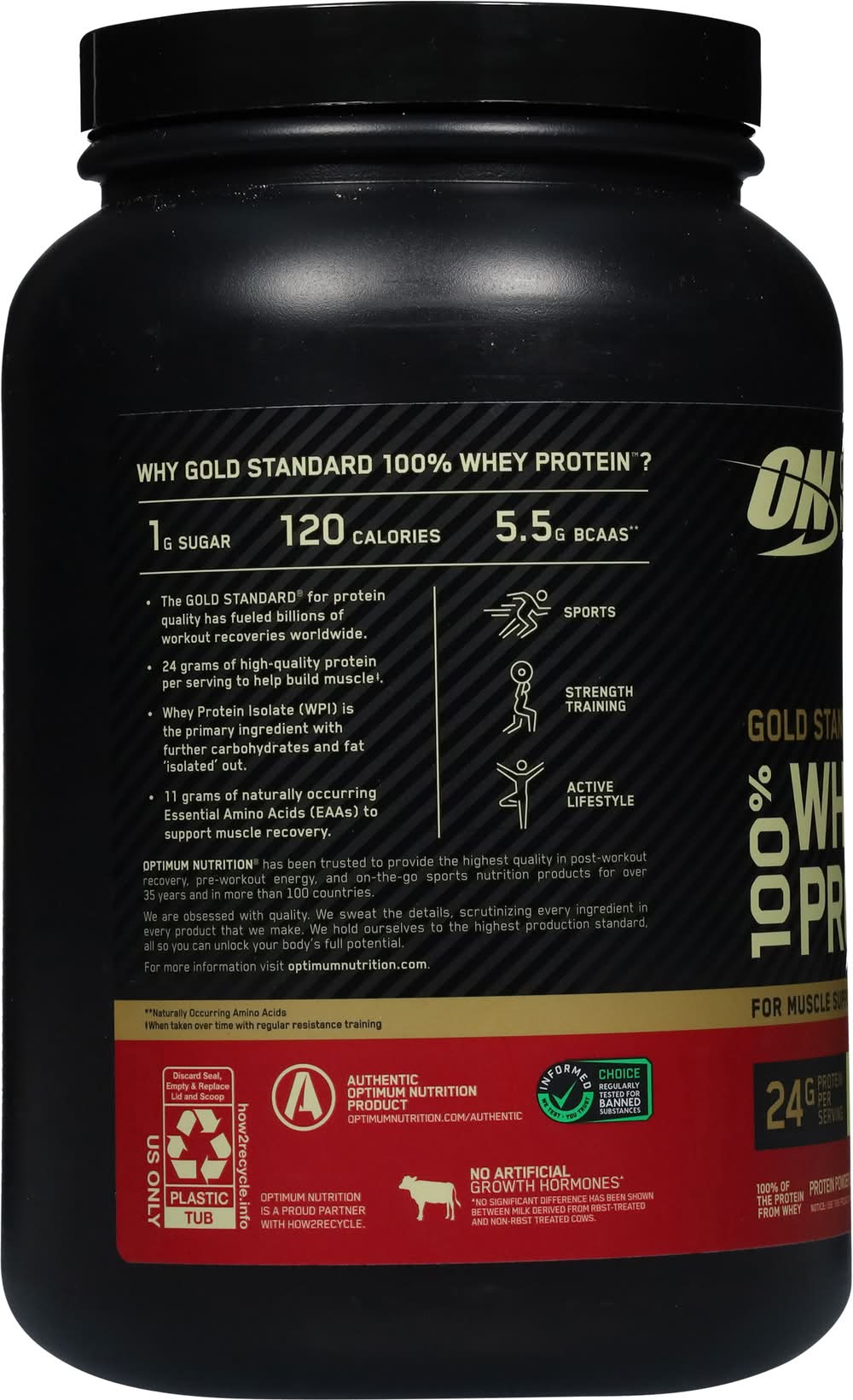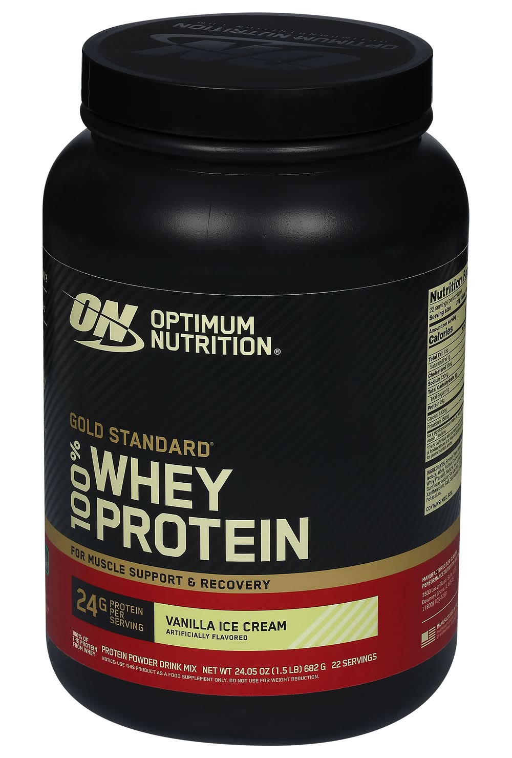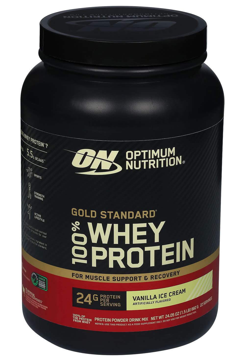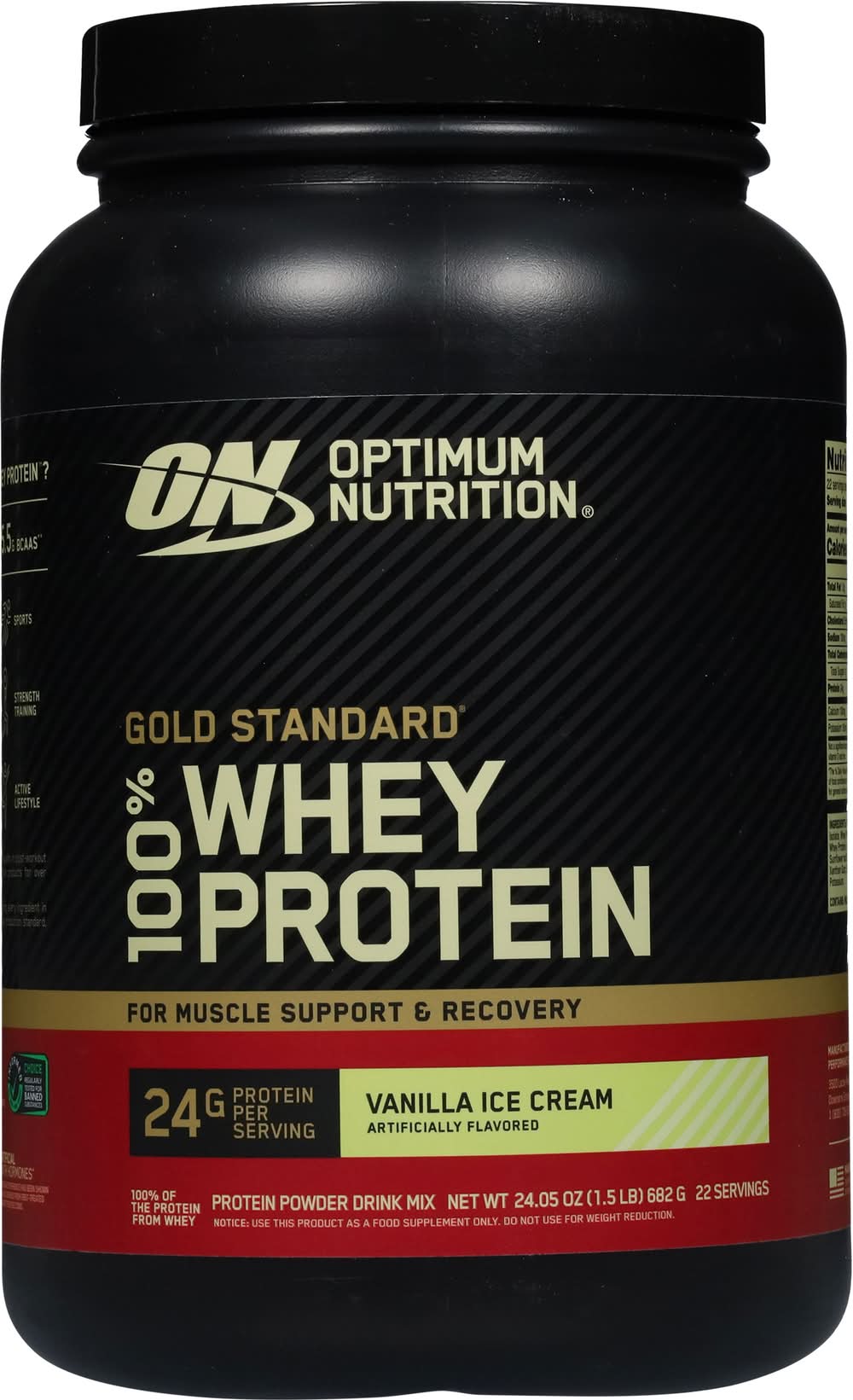 Optimum Nutrition Gold Standard 100% Whey Protein Powder helps build and maintain muscle mass when taken regularly and combined with strength training exercise. Made with whey protein isolate as the primary ingredient, this protein supplement powder ensures that you're getting high quality protein with every serving. The hydrolyzed whey protein powder isolate creates a post-workout drink mix that supports muscle recovery. Each serving of this delicious flavored protein powder provides 24 grams of all whey protein, along with 5.5 grams of branch-chained essential amino acids (BCAAs) to support after workout muscle recovery. Optimum Nutrition protein powder mixes easily using a shaker cup or blended in a smoothie. Gold Standard 100% Whey has fueled billions of workout recoveries worldwide. • Flavor: Vanilla ice cream • Packaging: Reusable