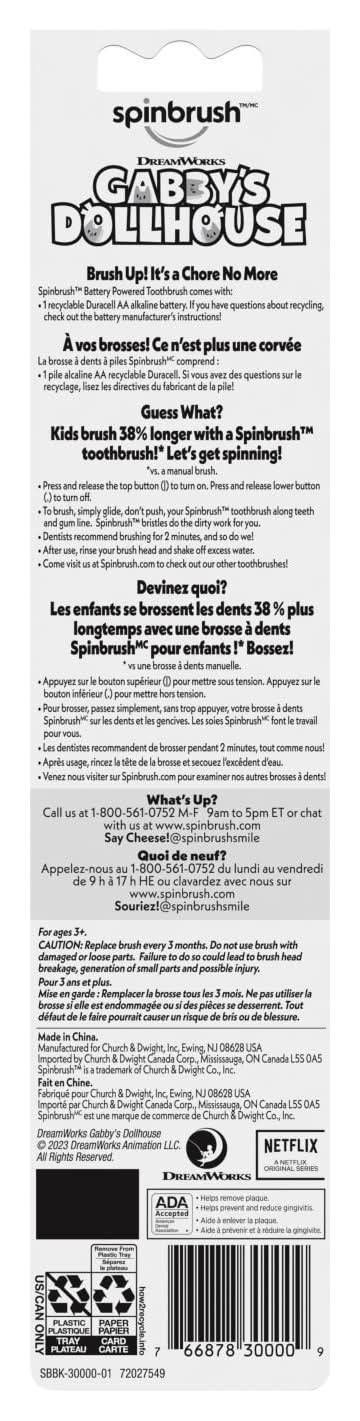 Spinbrush Gabby's Dollhouse Kids Electric Battery Toothbrush For Ages Above 3 and Up