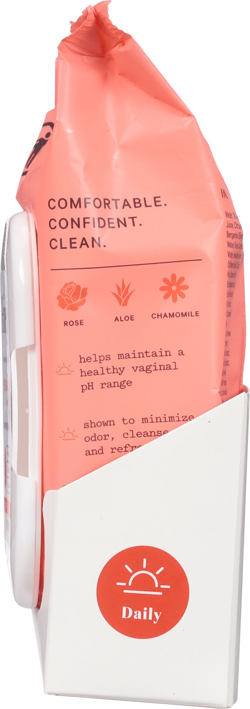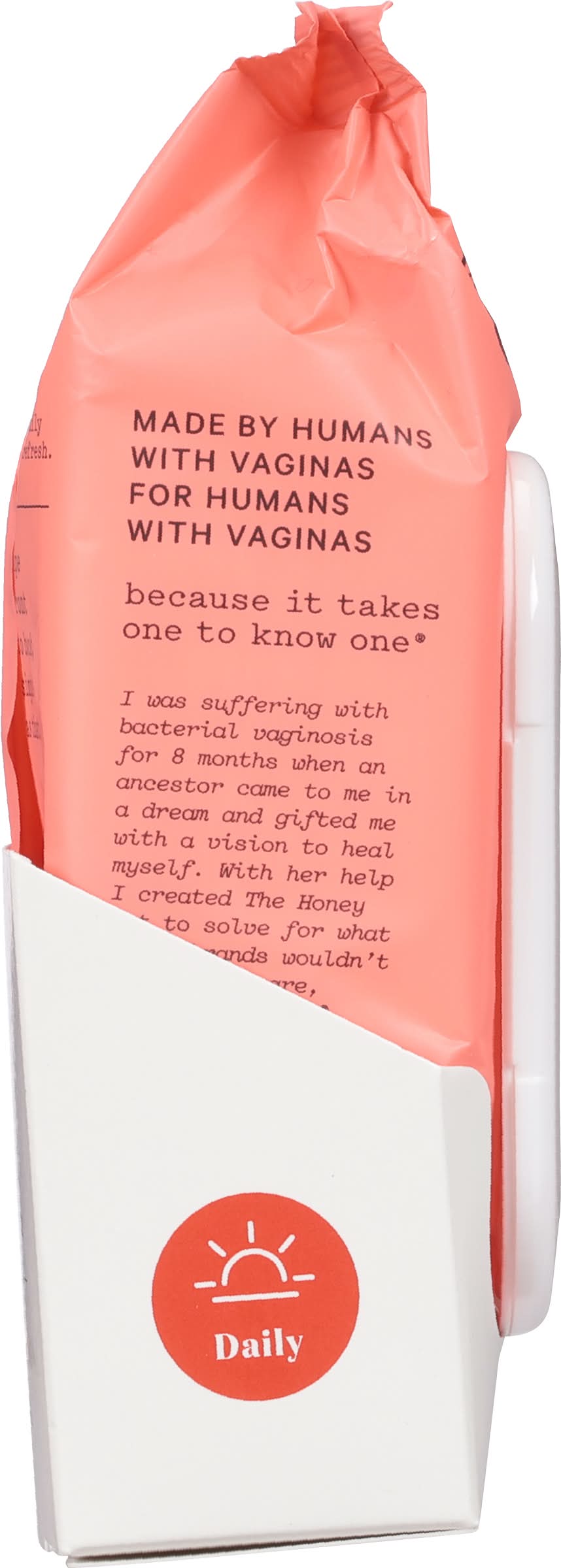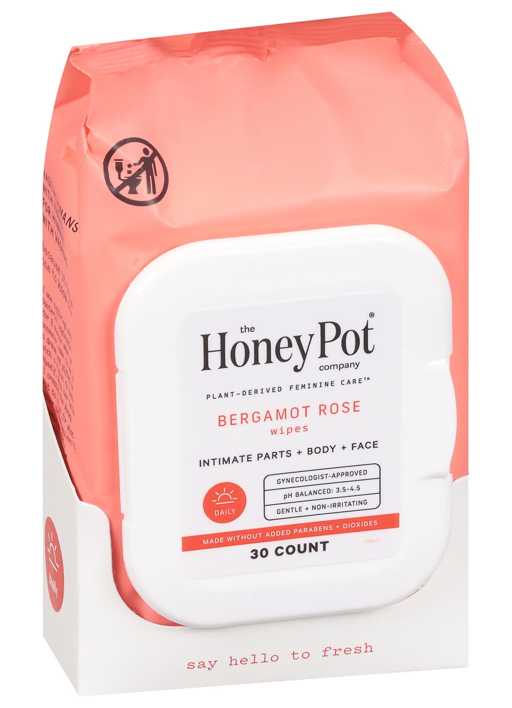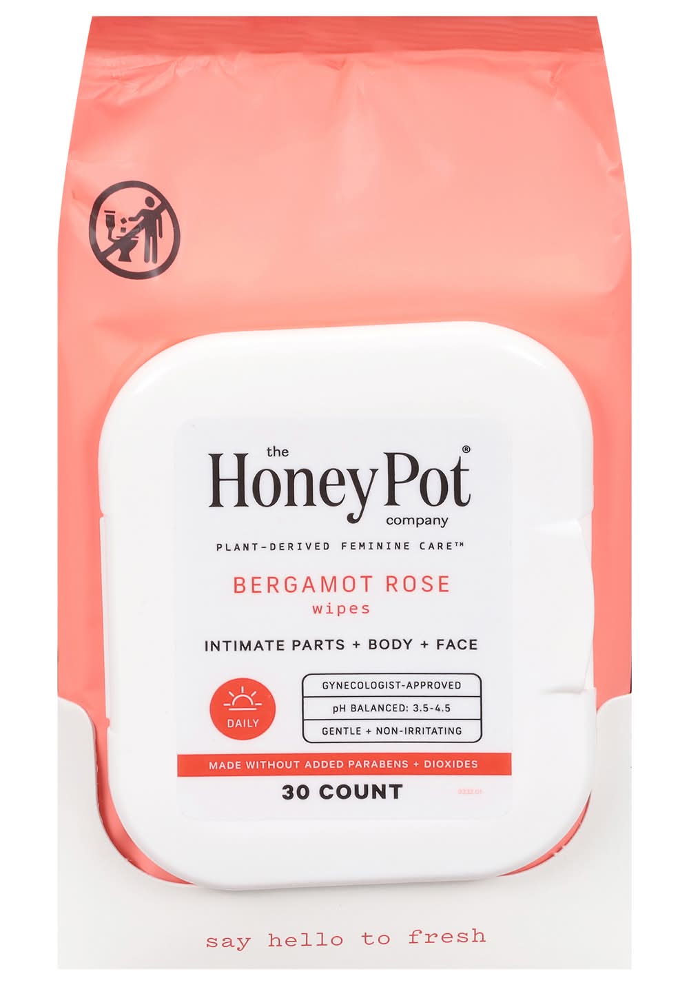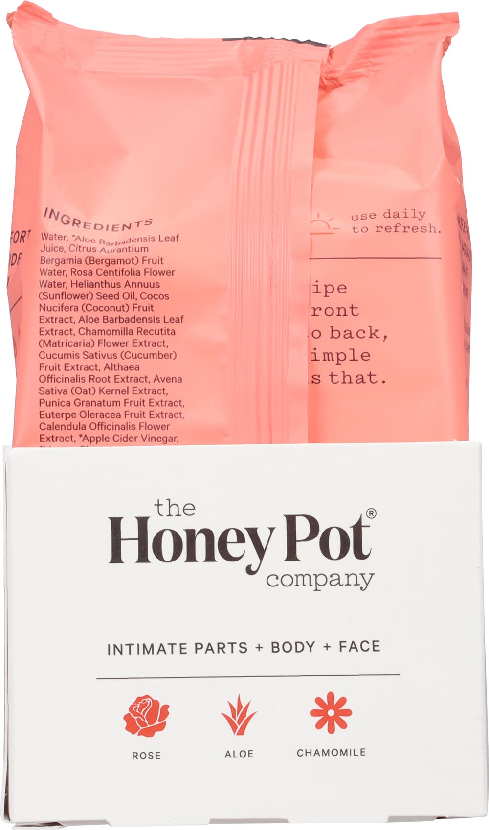 The Honey Pot Co’s community-favorite feminine wipes now in botanical Bergamot Rose. Feel fresh no matter where. These cleansing wipes are infused with bergamot and rose to both soothe, refresh and moisturize. Maintain your pH balance in seconds with these gentle, plant-derived feminine wipes – no residue, no added artificial fragrances – just rosy. They can also be used as period wipes so you can stay fresh no matter the circumstance. Always make sure to wipe from front to back - just like that. Combine with our Bergamot Rose wash and spray for all-day fresh!