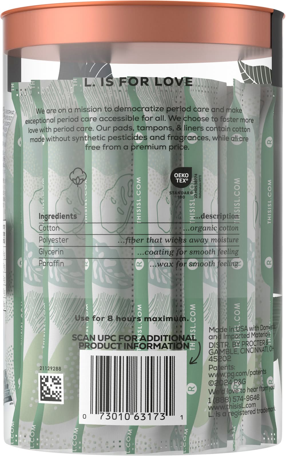 At L, we believe that period care should be both gentle on skin and powerful. Our mission is to provide exceptional protection you can trust. Our pads, tampons, and liners are made without synthetic pesticides and fragrances and crafted with a powerful leak-stopping design. We prioritize using only high-quality ingredients, including an organic cotton core in our tampons and an organic cotton top layer on our pads and liners. Experience the perfect balance of gentle and powerful protection with L., because you deserve nothing less. L. is for Loving Your Self: Our tampons contain a US grown organic cotton core, are made without synthetic pesticides and fragrances, and have applicators made without BPA. Also, our pads and liners are made with a US grown cotton top layer and are made without synthetic pesticides and fragrances. L. is for Lending A Hand: We see access to period care as fundamental for every body and an opportunity for change. We are on a mission to make exceptional period care accessible for all. Thats why we provide funding every year to non-profit, community-based organizations around the world that increase access to period care and menstrual health education. SAFETY STARTS WITH SCIENCE: Protection begins with safety. That's why at L. we have engineers, chemists, biologists, and safety scientists who evaluate every ingredient throughout the discovery, design, and development of our products. Ingredient safety is our top priority, so we are continuously studying new scientific research, reviewing consumer feedback, and connecting with experts, to ensure every product performs at its highest and safest level. QUALITY IS OUR OBSESSION: For us, creating a product you trust is more than just combining great ingredients - it's working with other companies that care about quality and safety as much as we do. We work hard to find the right partners and suppliers worldwide with ingredients that meet our standards. We draw from our resources to follow industry-leading testing methods on our ingredients and screen for background substances. We rely on proof and data when selecting our ingredients, but also for setting standards on how our products are made. • female • This is L. Inc., Cincinnati, OH.