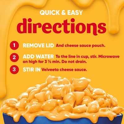 When your drip is as smooth as ours, you don’t waste time when it comes to delicious indulgence. For instant cheesy gratification, our original recipe hits the mark, with iconic, velvety meltability and tender pasta shells that grip the drip like no other. Velveeta’s supremely creamy texture and rich, savory taste satisfy your cravings any day of the week. Amp things up by customizing our cheesy pasta with added veggies, meat, toppings or seasonings. Sometimes unnecessary is necessary, so kick back, relax and embrace the flavor, whether it’s in the form of a snack, side dish or entree. Luxuriously convenient, preparing single-serve Velveeta Shells and Cheese cup is a breeze. Simply remove lid and sauce pouch, add water up to the fill line, microwave uncovered for 3-1/2 minutes, stir in the liquid gold cheese sauce and enjoy, unapologetically. • Pack size: 4 • Kraft Heinz Foods Company, Chicago, IL 60601 • Packaging: Reusable