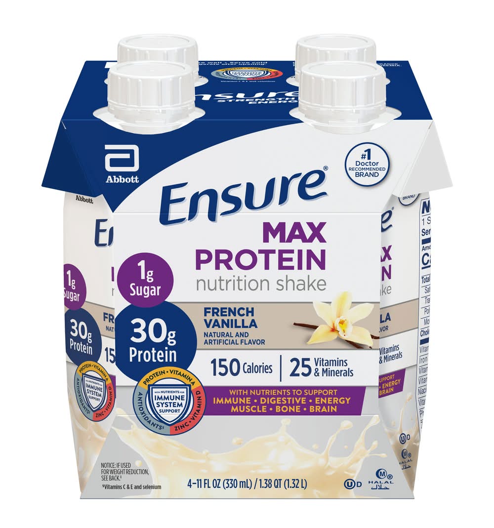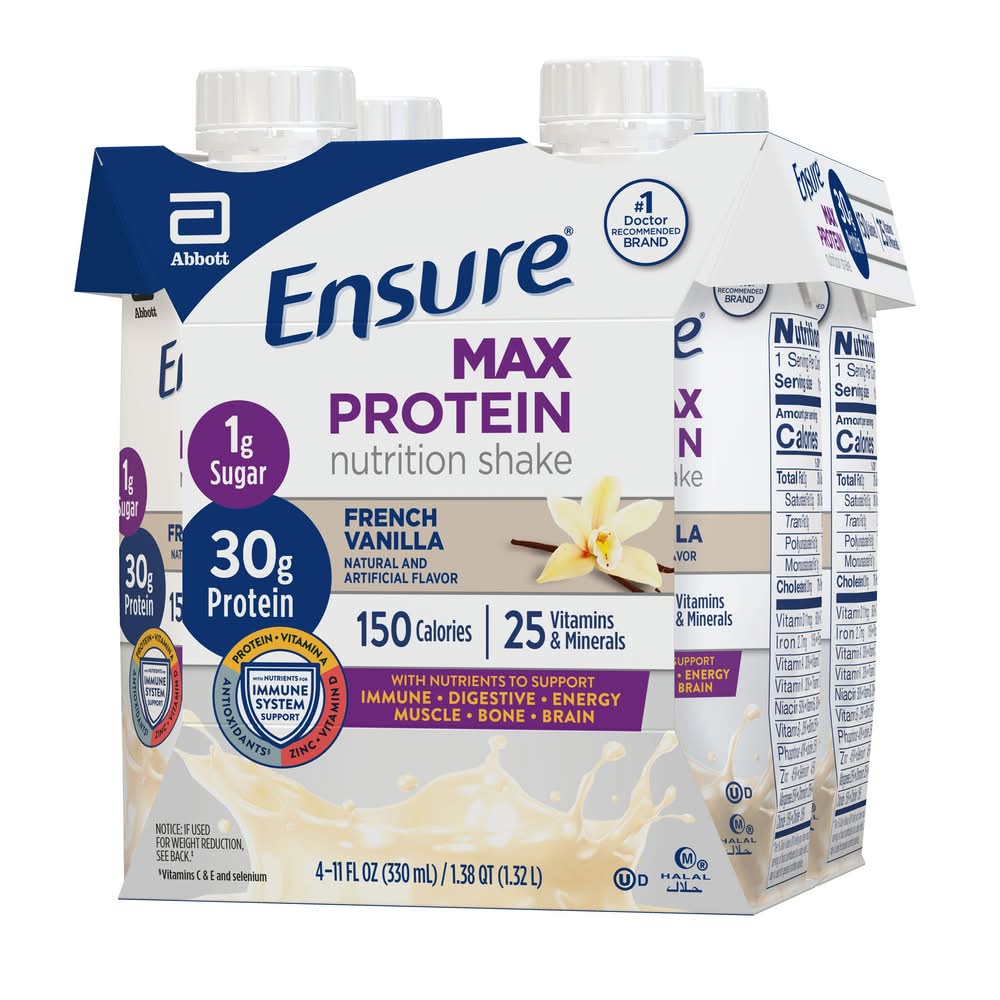 Ensure Max Protein French Vanilla Nutrition Shake is a ready-to-drink beverage designed to support a healthy, active, and energetic lifestyle. Formulated with essential vitamins and minerals, including vitamins A, D, and zinc, and enriched with antioxidants such as vitamins C and E, it aids in supporting immune health. This product is suitable for individuals with lactose intolerance and is gluten-free. However, it is not suitable for individuals with galactosemia. New flavor options are available for those interested in variety. Additionally, it can be purchased with Supplemental Nutrition Assistance Program (SNAP) benefits. • Flavor: French vanilla • Pack size: 4