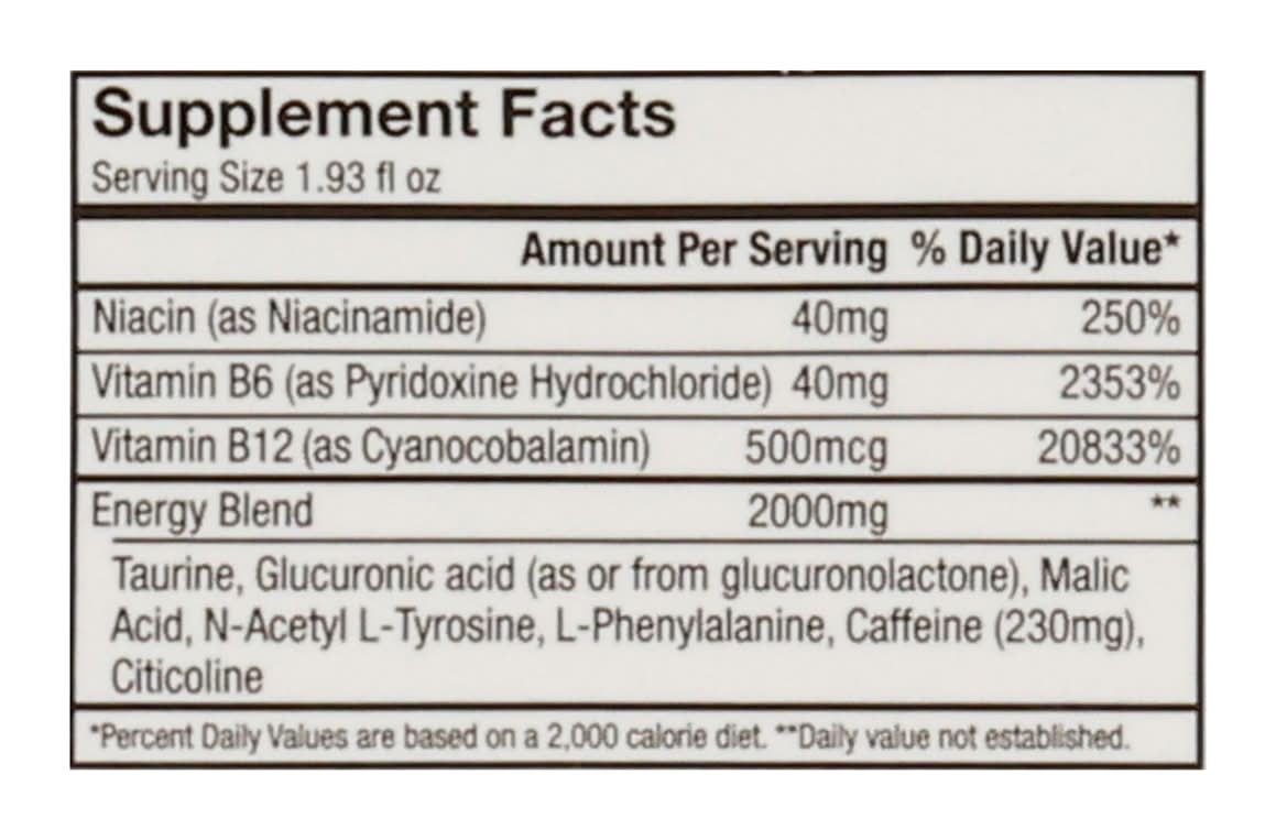 Ingredients: Energy Blend: Taurine, Glucuronic Acid as or from Glucuronolactone, Malic Acid, N-Acetyl L-Tyrosine, L-Phenylalanine, Caffeine 230 mg, Citicoline. Other Ingredients: Purified Water; Natural and Artificial Flavors; Sucralose; Potassium Sorbate, Sodium Benzoate and EDTA to Protect Freshness. Contains 230mg of caffeine