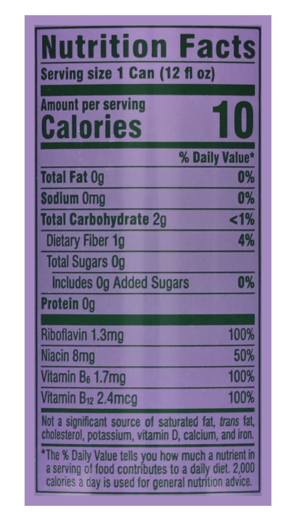 Ingredients: Carbonated Water, Citric Acid, Galactomannan Prebiotic Fiber, Taurine, Natural Flavors, L-Theanine, Natural Caffeine (from Green Coffee Bean Extract), Potassium Benzoate (Preservative), Sucralose, Potassium Citrate, Asian Ginseng (Panax Ginseng) Root Extract, Patented Lychee Fruit Extract & Green Tea Leaf Extract, Apple Cider Vinegar, Niacinamide, Pyridoxine HCl (Vitamin B6), Riboflavin, Cyanocobalamin (Vitamin B12)