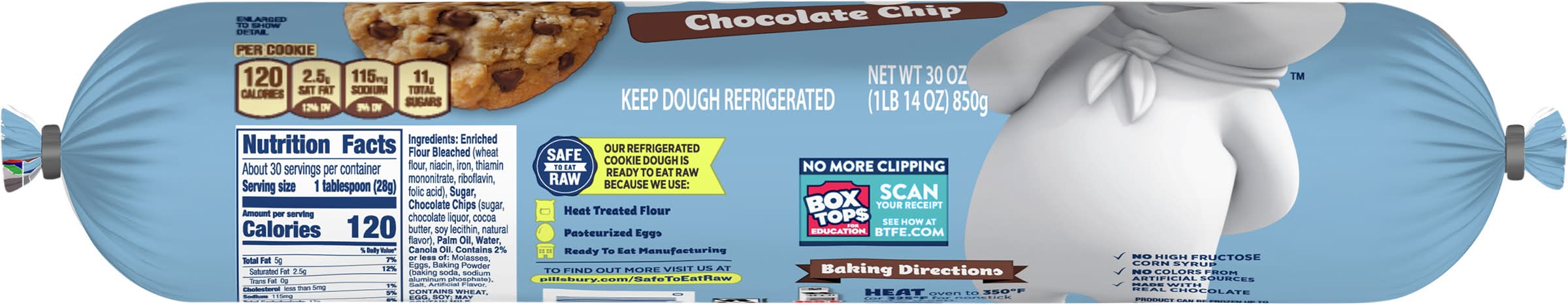 Add sweet joy to any occasion with Pillsbury Chocolate Chip Cookie Dough. It’s made with real chocolate, no high fructose corn syrup and no colors from artificial sources for the homestyle goodness you know and love. Unlike with cookie mix, you can have chocolate chip cookies ready in minutes with no mixing, no mess. Serve oven-fresh Pillsbury Chocolate Chip Cookies for a birthday party, cookie exchange or goodie bags treat. Use refrigerated dough to make chocolate chip dessert bars. Ready-to-bake Chocolate Chip Cookies make great food gifts for friends and family. Cookies are a great way to bring crowd-pleasing chocolate treats to your potluck, party snacks spread, gift baskets or care packages. You can even eat the refrigerated cookie dough uncooked (look for the “safe to eat raw” seal!). Pair with a glass of cold milk and dare to dunk. This value size pack makes 30 cookies.