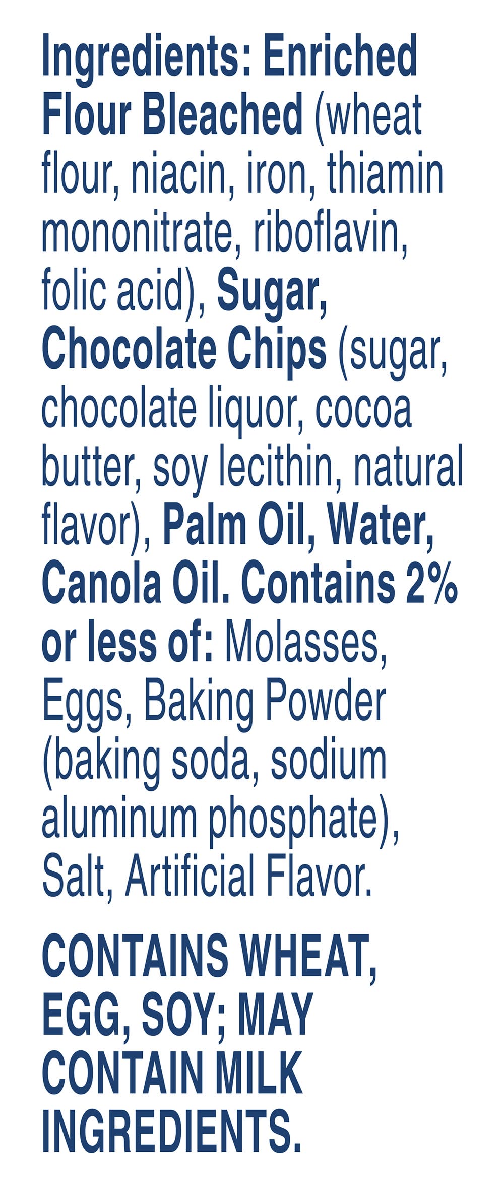 Ingredients: Enriched Flour Bleached (Wheat Flour, Niacin, Iron, Thiamin Mononitrate, Riboflavin, Folic Acid), Sugar, Chocolate Chips (Sugar, Chocolate Liquor, Cocoa Butter, Soy Lecithin, Natural Flavor), Palm Oil, Water, Canola Oil. Contains 2% or Less of: Molasses, Eggs, Baking Powder (Baking Soda, Sodium Aluminum Phosphate), Salt, Artificial Flavor Contains: Wheat, Soybeans, Eggs, Milk