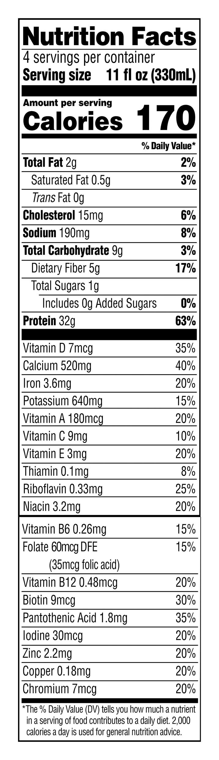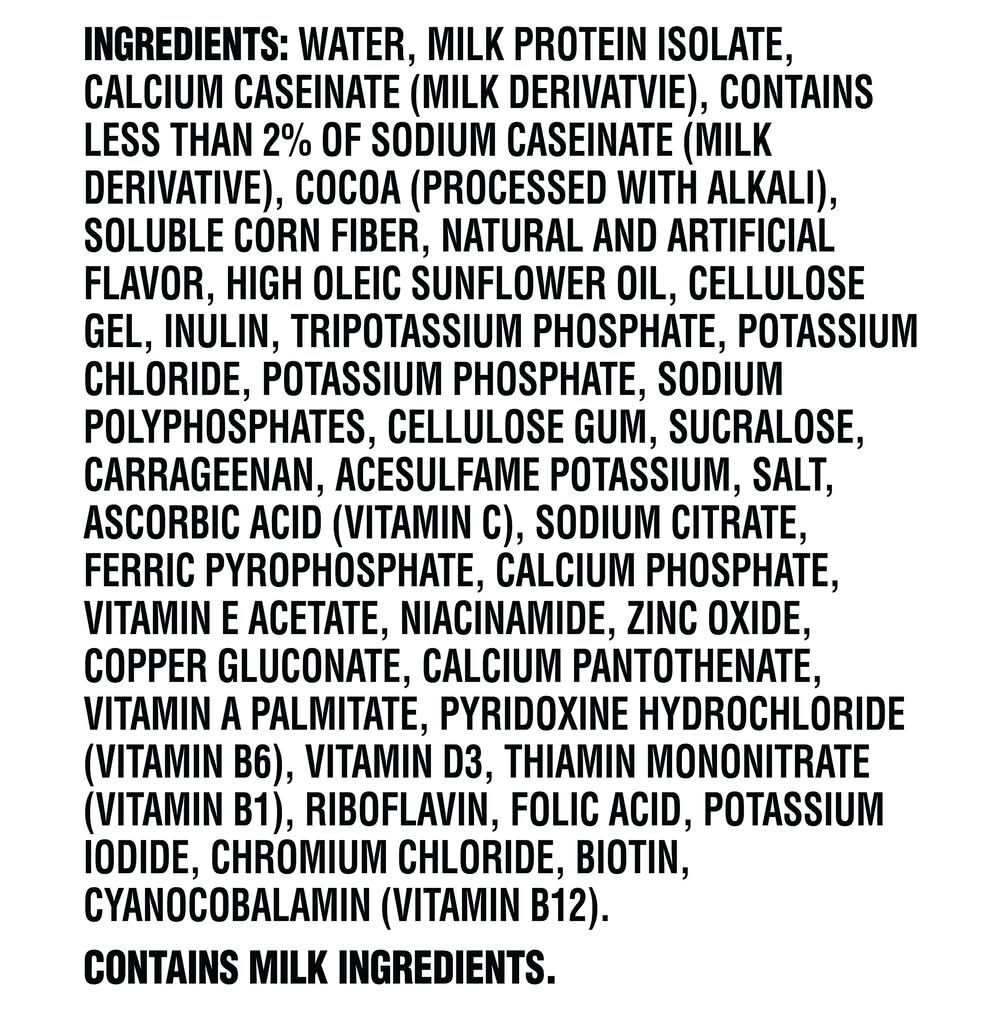 Ingredients: Water, Milk Protein Isolate, Calcium Caseinate (Milk Derivative), Contains Less than 2% of Sodium Caseinate (Milk Derivative), Cocoa (Processed with Alkali), Soluble Corn Fiber, Natural and Artificial Flavor, High Oleic Sunflower Oil, Cellulose Gel, Inulin, Tripotassium Phosphate, Potassium Chloride, Potassium Phosphate, Sodium Polyphosphates, Cellulose Gum, Sucralose, Carrageenan, Acesulfame Potassium, Salt, Ascorbic Acid (Vitamin C), Sodium Citrate, Ferric Pyrophosphate, Calcium Phosphate, Vitamin E Acetate, Niacinamide, Zinc Oxide, Copper Gluconate, Calcium Pantothenate, Vitamin A Palmitate, Pyridoxine Hydrochloride (Vitamin B6), Vitamin D3, Thiamin Mononitrate (Vitamin B1), Riboflavin, Folic Acid, Potassium Iodide, Chromium Chloride, Biotin, Cyanocobalamin (Vitamin B12) Contains: Milk