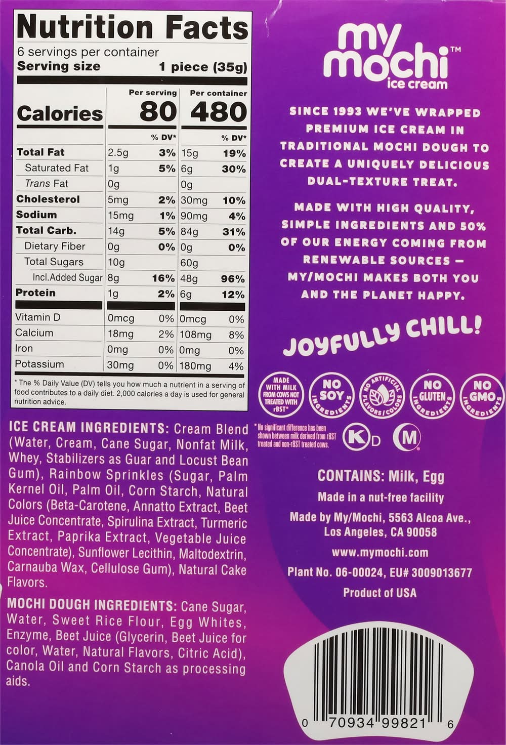 Ingredients: Ice Cream Ingredients: Cream Blend (Water, Cream, Cane Sugar, Nonfat Milk, Whey, Stabilizers as Guar and Locust Bean Gum), Rainbow Sprinkles (Sugar, Palm Kernel Oil, Palm Oil, Corn Starch, Natural Colors (Beta-Carotene, Annatto Extract, Beet Juice Concentrate, Spirulina Extract, Turmeric Extract, Paprika Extract, Vegetable Juice Concentrate), Sunflower Lecithin, Maltodextrin, Carnauba Wax, Cellulose Gum), Natural Cake Flavors. Mochi Dough Ingredients: Cane Sugar, Water, Sweet Rice Flour, Egg Whites, Enzyme, Beet Juice (Glycerin, Beet Juice for Color, Water, Natural Flavors, Citric Acid), Canola Oil and Corn Starch as Processing Aids Contains: Milk, Eggs