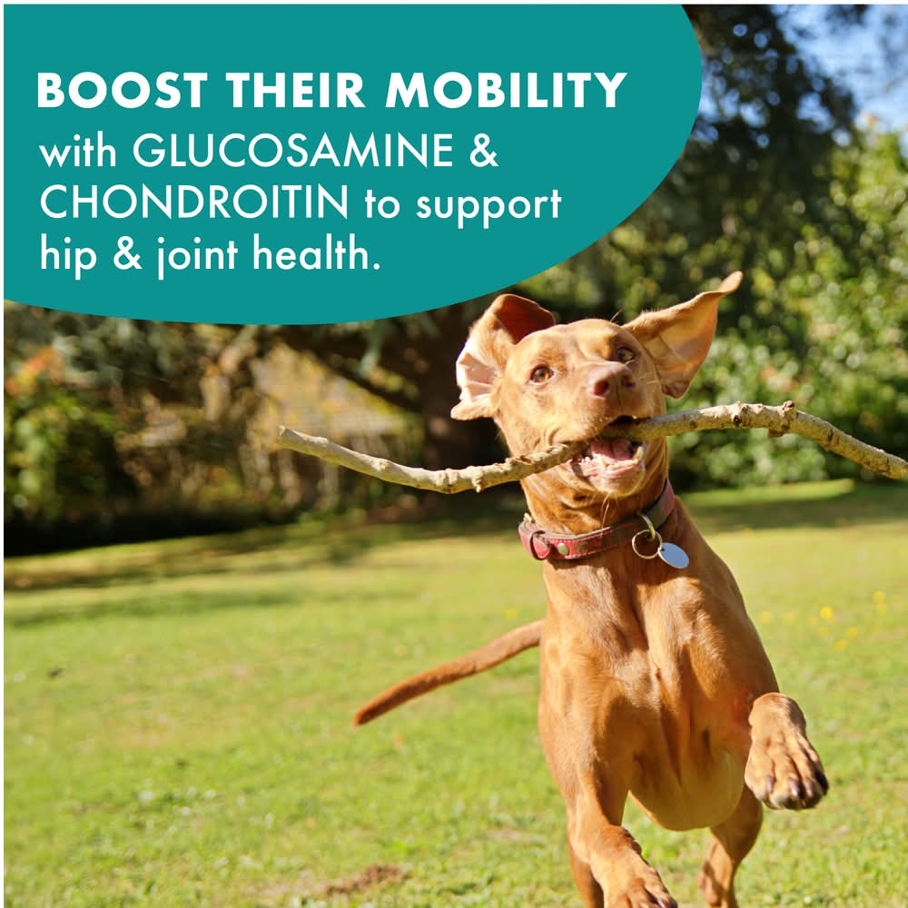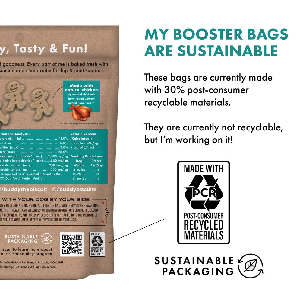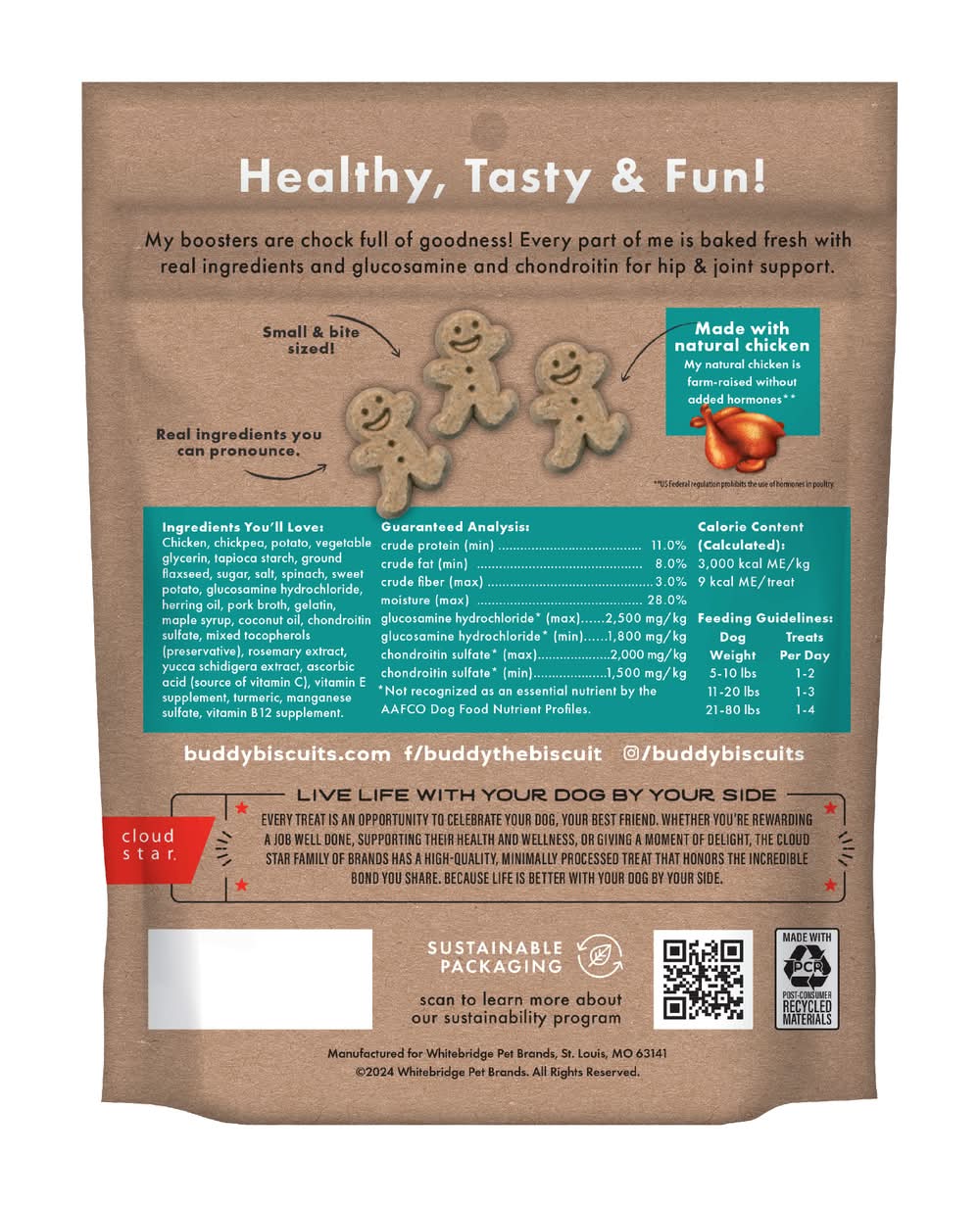 Buddy Biscuits Hip & Joint Chews Chicken Treats for Adult Dogs are formulated to support hip and joint health with the inclusion of glucosamine and chondroitin. These treats are crafted with natural chicken and do not contain artificial colors, flavors, fillers, or additives. The ingredients are simple, making the chews a healthy and tasty option for your pet. Each chew is oven-baked to create a delicious snack that is also low in calories, with only 9 calories per treat. These bite-sized treats are ideal for use as small rewards during training or as a little snack. The chewy texture is enjoyable for dogs, and the treats are made with chicken that is farm-raised without added hormones, adhering to federal regulations. Buddy Biscuits treats are baked in the USA.