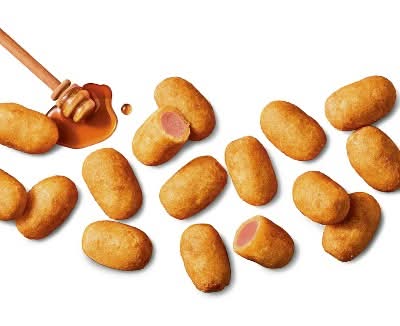 With Mini Corn Dogs from market pantry, you can enjoy a fair and carnival classic right from your own home. This box of corn dogs comes with approximately 40 corn dogs made up of chicken franks dipped in a cornmeal batter made with real honey for just a hint of sweetness. Each corn dog comes in a mini size that's perfect for dipping and easy munching whether you're eating them at your kitchen table or walking around with a plateful at a backyard barbecue. The bite-size corn dogs are microwaveable for easy prep, and each serving there is 7 grams of protein. Just dip in your favorite sauces and enjoy with sides like coleslaw, salad or mac and cheese.