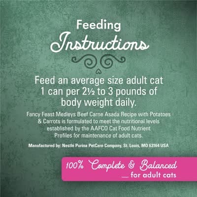 Delight your cat with chef-inspired, cat-adored Purina Fancy Feast Medleys Beef Carne Asada Recipe With Potatoes and Carrots in Savory Juices Adult Cat Food. This savory cat food is 100 percent complete and balanced for adult cats and includes real beef for a taste cats love, plus potatoes and carrots to add a colorful touch for delicious goodness you can see. The exceptional Latin America-inspired recipe makes each bite a true feast for her senses, while the tender canned cat food texture is sure to please her palate. Meanwhile, real, high-quality ingredients offer you added peace of mind that your feline is getting the nourishment she needs along with a taste she loves with no artificial colors. The savory Fancy Feast Medleys wet cat food juices add moisture to this entree, and the essential vitamins and minerals help to support her overall health and wellness. Satisfy her cravings for gourmet dishes every time you reach for a can of this adult cat food recipe. Packaging: Reusable