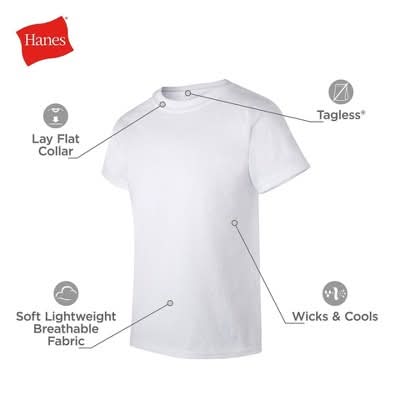 Boys' crewneck undershirts are crafted from lightweight, breathable fabric that resists shrinkage for a fit designed to stay true. You'll appreciate the moisture-wicking Cool Comfort fabric that keeps him cool and comfortable. Plus, the Tagless interior means no scratchy tags bunching up. And thanks to the famous Hanes lay-flat collar, these boys' t-shirts look great layered under polos, dress shirts, and more. • Color: White • Size: XL