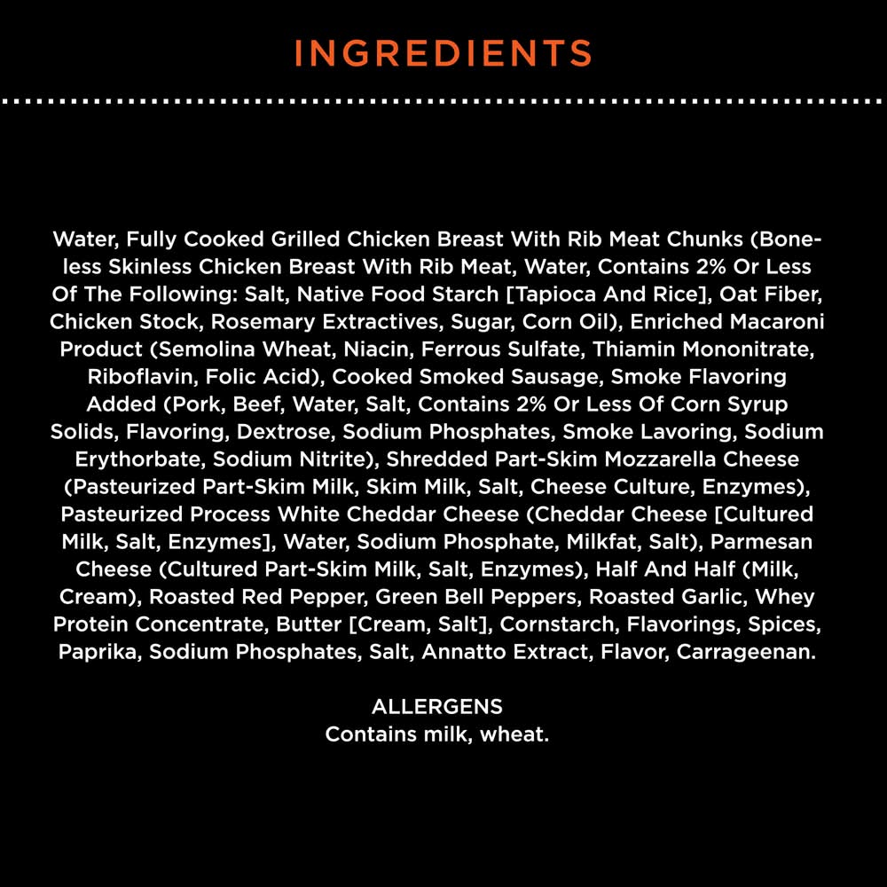 Ingredients: WATER, FULLY COOKED GRILLED CHICKEN BREAST WITH RIB MEAT CHUNKS (BONELESS SKINLESS CHICKEN BREAST WITH RIB MEAT, WATER, CONTAINS 2% OR LESS OF THE FOLLOWING: SALT, NATIVE FOOD STARCH [TAPIOCA AND RICE], OAT FIBER, CHICKEN STOCK, ROSEMARY EXTRACTIVES, SUGAR, CORN OIL), ENRICHED MACARONI PRODUCT (SEMOLINA WHEAT, NIACIN, FERROUS SULFATE, THIAMIN MONONITRATE, RIBOFLAVIN, FOLIC ACID), COOKED SMOKED SAUSAGE, SMOKE FLAVORING ADDED (PORK, BEEF, WATER, SALT, CONTAINS 2% OR LESS OF CORN SYRUP SOLIDS, FLAVORING, DEXTROSE, SODIUM PHOSPHATES, SMOKE FLAVORING, SODIUM ERYTHORBATE, SODIUM NITRITE), SHREDDED PART-SKIM MOZZARELLA CHEESE (PASTEURIZED PART-SKIM MILK, SKIM MILK, SALT, CHEESE CULTURE, ENZYMES), PASTEURIZED PROCESS WHITE CHEDDAR CHEESE (CHEDDAR CHEESE [CULTURED MILK, SALT, ENZYMES], WATER, SODIUM PHOSPHATE, MILKFAT, SALT), PARMESAN CHEESE (CULTURED PART-SKIM MILK, SALT, ENZYMES), HALF AND HALF (MILK, CREAM), ROASTED RED PEPPER, GREEN BELL PEPPERS, ROASTED GARLIC, WHEY PROTEIN CONCENTRATE, BUTTER [CREAM, SALT], CORNSTARCH, FLAVORINGS, SPICES, PAPRIKA, SODIUM PHOSPHATES, SALT, ANNATTO EXTRACT, FLAVOR, CARRAGEENAN. Contains: CONTAINS: MILK, WHEAT.