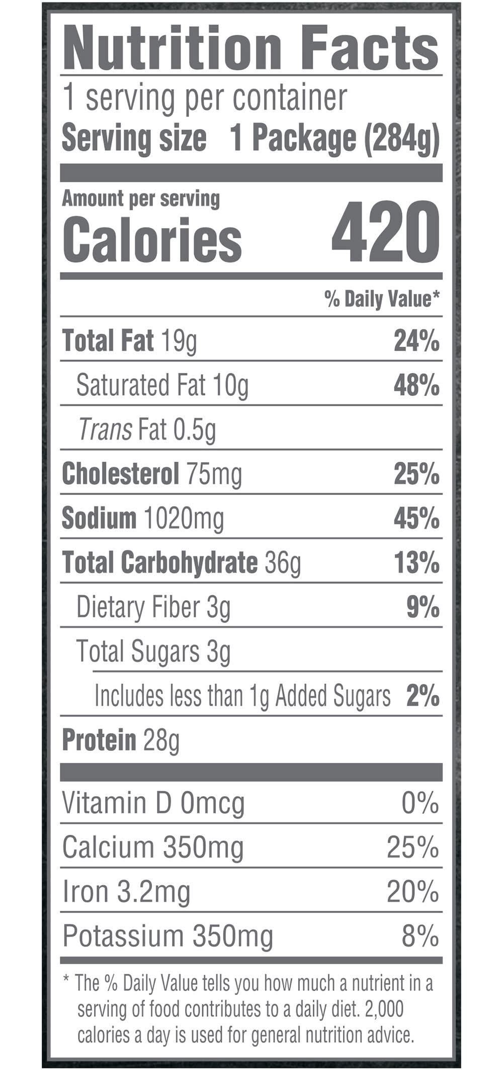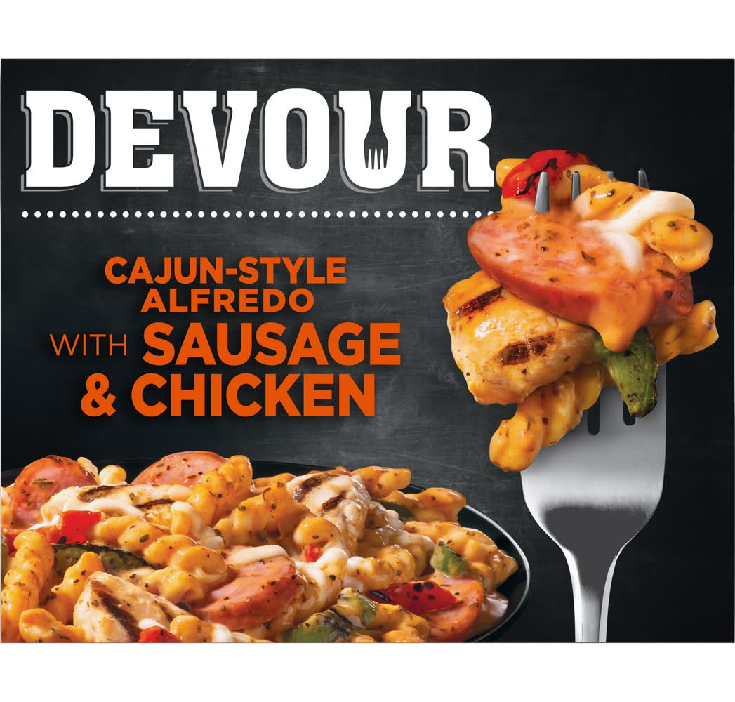 DEVOUR Cajun Style Alfredo With Sausage & Chicken dials up the taste, maxes out the flavor and turns up the texture in this easy to make single serve frozen dinner. This hearty Cajun chicken pasta frozen entree is sure to satisfy big appetites. This savory meal is packed with slices of smoked sausage, juicy chunks of tender grilled chicken and perfectly roasted peppers all piled over a bed of gemelli pasta with curves to sop up that mouthwatering creamy Cajun Alfredo sauce. Ready to eat in minutes, this single serve 10 ounce dinner comes in a microwaveable serving tray for fast and convenient feasting. DEVOUR Frozen Foods make it easy to enjoy hot, mouthwatering food at home or in the break room, so be sure to keep your freezer stocked with deliciousness. Excite your taste buds with this incredible Cajun style easy frozen meal. Devour Foods LLC, 200 E. Randolph St.,Chicago,IL,60601