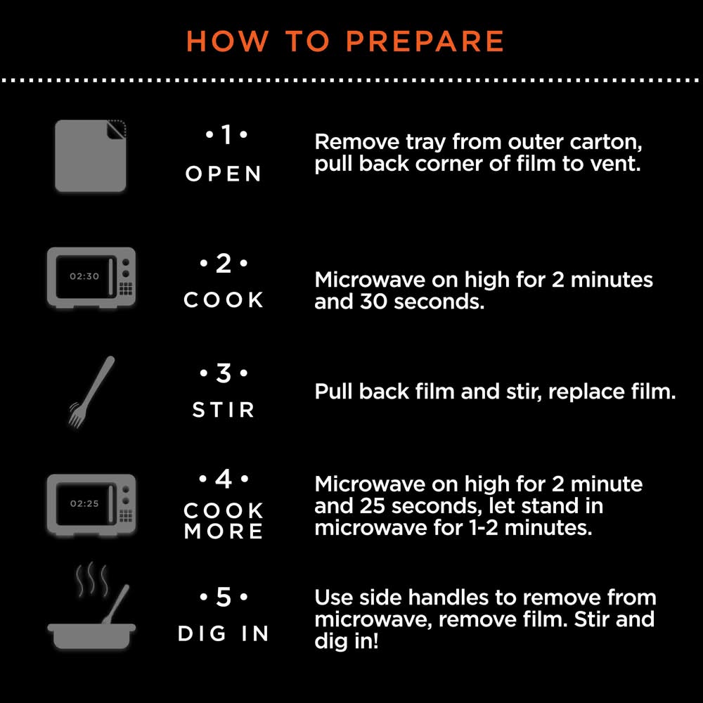 Directions for use: See cooking instructions. Cook thoroughly. For food safety and best quality, follow these cooking instructions: Keep frozen until ready to use. Cook thoroughly before eating. Adjustment to cooking times may be required due to variations in all microwave ovens. Use caution as product and packaging will be hot. Do not reuse tray. Do not prepare in conventional or toaster oven. Check that product is cooked thoroughly. Internal temperature needs to reach 165 degrees F as measured by a food thermometer. Cooking Instructions: 1100 watt microwave on high. Remove: Remove tray from outer carton; pull back corner of film to vent. Cook: On high for 2 minutes and 30 seconds. Stir: Pull back film and stir. Replace film. Cook more: On high for 2 minutes and 45 seconds. Let stand in microwave 1-2 minutes. Dig In: When removing from microwave, hold onto the tray's side handles. Remove film. Stir and enjoy. Keep frozen. Storage recommendation: Keep frozen.