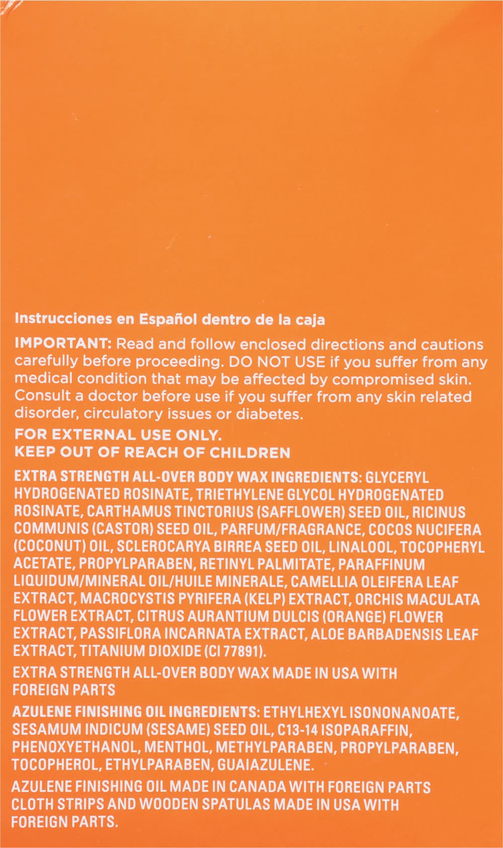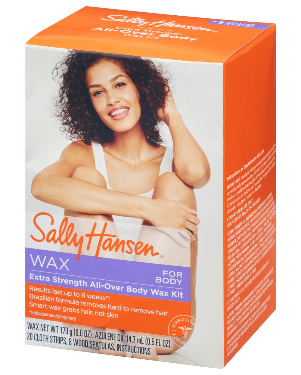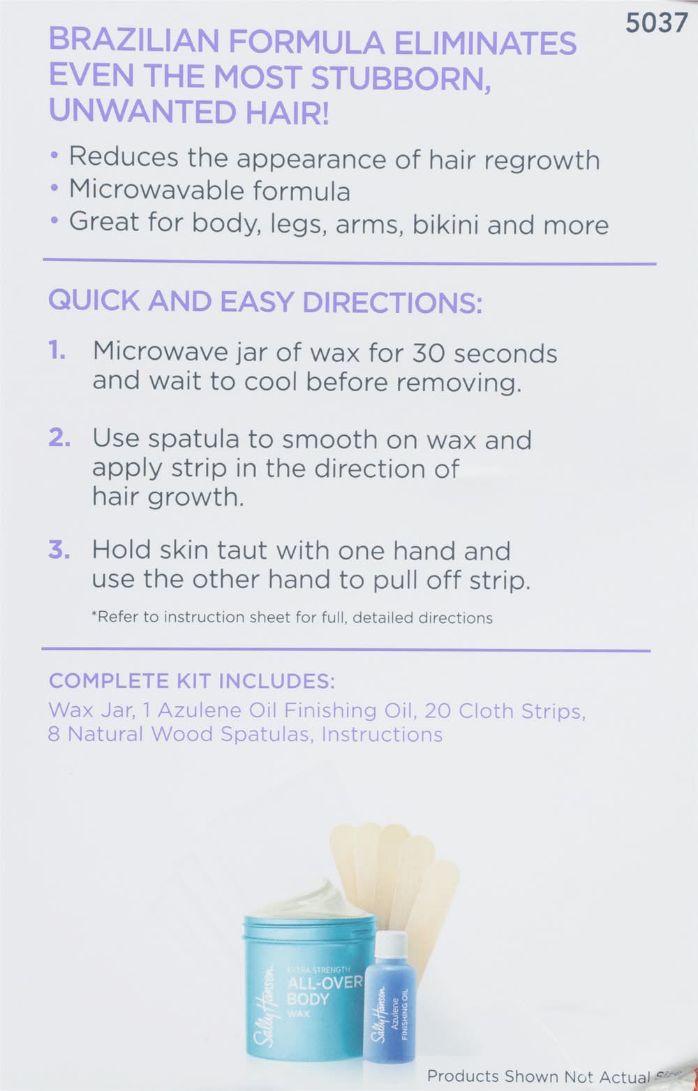 Wax net wt 170 g (6.0 oz), azulene oil 14.7 ml (0.5 fl oz) 20 cloth strips, 8 wood spatulas, instructions. Complete Kit Includes: Wax jar, 1 azulene oil finishing oil. 20 cloth strips, 8 natural wood spatulas, instructions. Extra Strength all - over body wax kit. Results last up to 8 weeks (Individual results may vary)!. Brazilian formula removes hard to remove hair. Smart wax grabs hair, not skin. Infused with coconut & marula oils. (Hashtag) 1 selling brand in the USA!. Brazilian Formula Eliminates Even The Most Stubborn, Unwanted Hair! Reduces the appearance of hair regrowth. Microwavable formula. Great for body, legs, arms, bikini and more. Product shown not actual size. Dermatologist & Salon tested. sallyhansen.com. 1 800 953 5080 (USA / Canada Only). Extra Strength All Over Body Wax made in USA with Foreign parts. Azulene Finishing Oil made in Canada with foreign parts cloth strips and wooden spatulas made in USA with foreign parts. Coty Inc., New York, NY, 10118, Ph: 800-953-5080