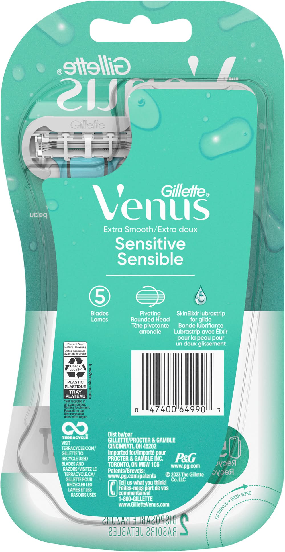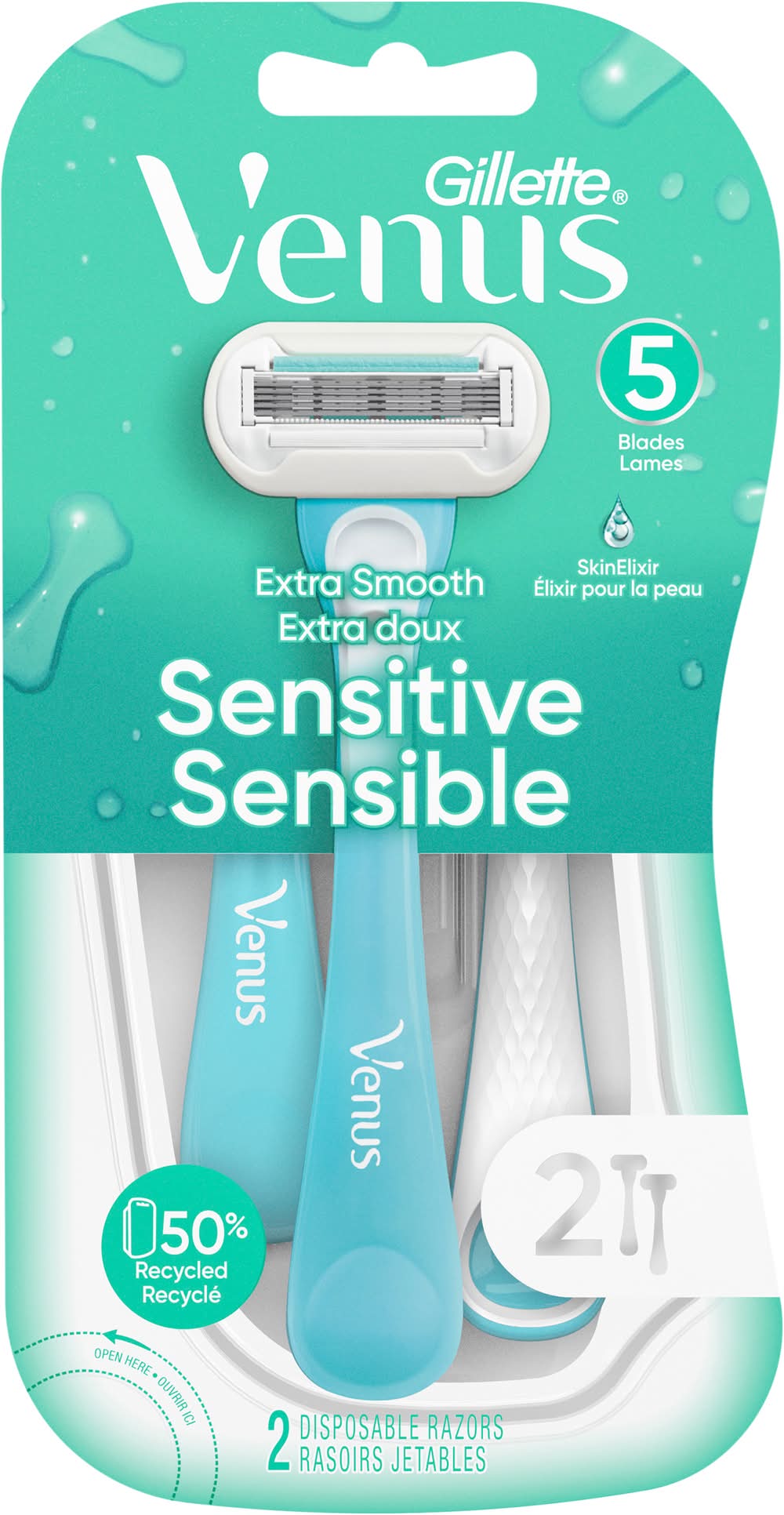Venus female razor blades are designed with a woman's body in mind. From handles designed for a comfortable grip to pivoting heads that contour to your body, Venus razors are designed to help reveal touchably smooth skin. Venus Extra Smooth Sensitive women's disposable razors are perfect for protecting your sensitive skin. These razors feature 5 diamond-like coated blades for a long-lasting smooth shave and a SkinElixir lubrastrip for glide that releases a perfect dose of protection you can feel with up to 0% irritation (US Consumer Study Feb 2018). The SkinElixir lubrastrip activates when wet, providing your sensitive skin with a perfect dose of protection from nicks, cuts and irritation while shaving. The ergonomic razor handle is designed with a soft-grip gel to comfortably fit into your hands. These disposable razors for women also feature a pivoting head that adjusts to your curves, including ankles and knees. No awkwardly angling your razor. No razor blade change required; just grab a new one when you are no longer getting your best shave. For best results, use with your favorite Venus Shave Gel or Cream. • female • Packaging: Reusable