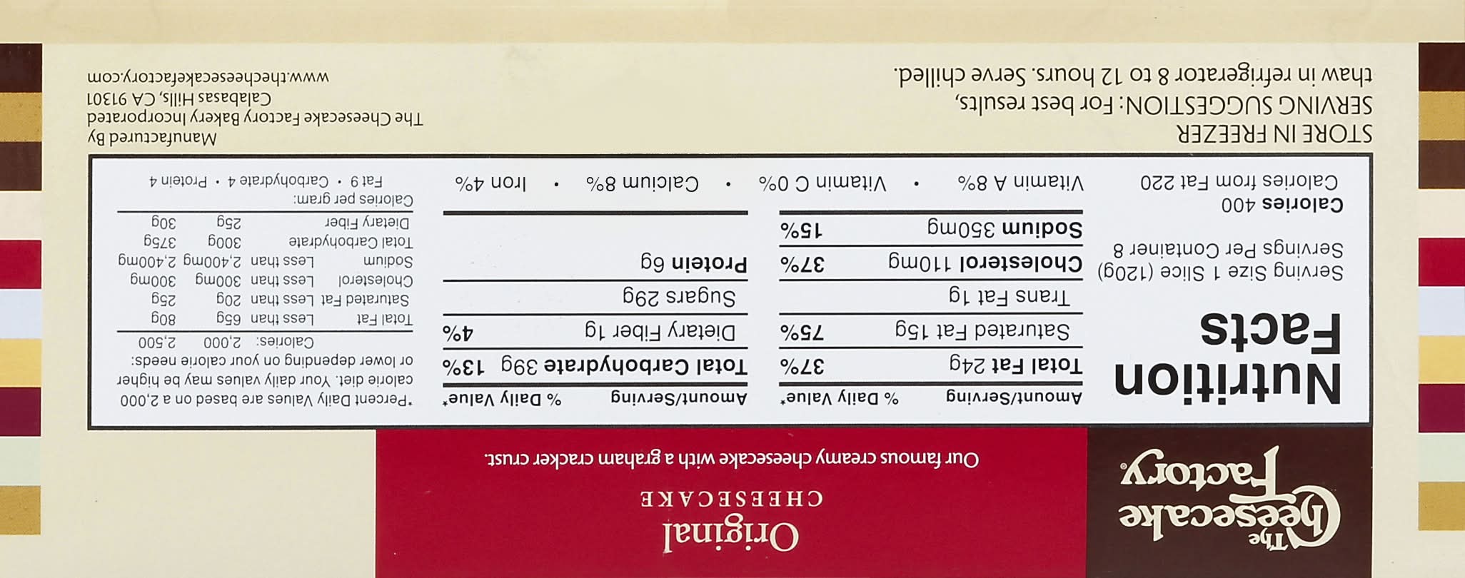 Ingredients: Cream Cheese (Pasteurized Milk and Cream, Cheese Culture, Salt, Stabilizers [Carob Bean and/or Xanthan and/or Guar Gums]), Sugar, Sour Cream (Pasteurized Grade A Cultured Milk, Cream, Nonfat Milk Solids, Enzymes), Whole Eggs, Graham Crumb (Wheat Flour, Whole Wheat Flour, Cane Sugar, Palm Oil, Honey, Sodium Bicarbonate, Salt), Vanilla, Crumb (Wheat Flour, Cane Sugar, Palm Oil, Whey [Milk], Salt, Sodium Bicarbonate, Natural Butter Vanilla Flavor), Margarine (Palm Oil, Palm Fractions, Water, Salt, Emulsifiers [Soya Lecithin, Distilled Monoglycerides], Natural Butter Flavor, Citric Acid [as Antioxidant], Vitamin A & Beta-Carotene), Artificial Vanilla, Flavor, Cinnamon Contains: Milk, Eggs, Soybeans, Wheat, Peanuts, Tree Nuts