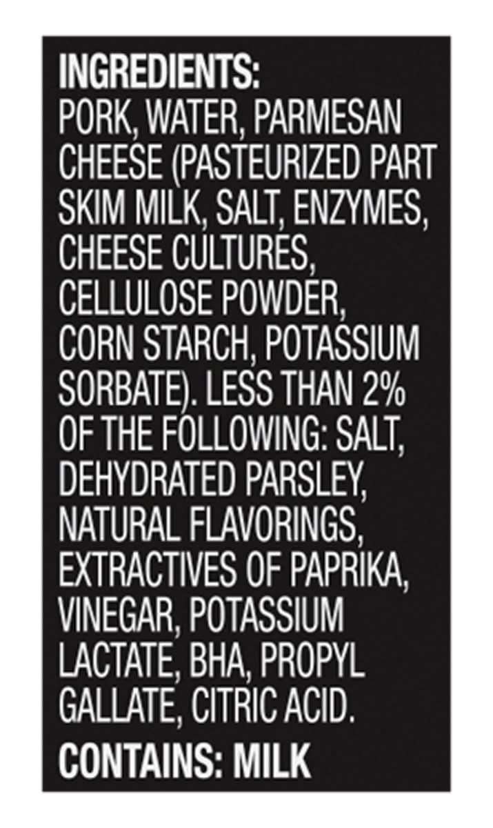 Ingredients: Pork, Water, Parmesan Cheese (Pasteurized Part Skim Milk, Salt, Enzymes, Cheese Cultures, Cellulose Powder, Corn Starch, Potassium Sorbate). Less than 2% of the Following: Salt, Dehydrated Parsley, Natural Flavorings, Extractives of Paprika, Vinegar, Potassium Lactate, BHA, Propyl Gallate, Citric Acid Contains: Milk, Corn