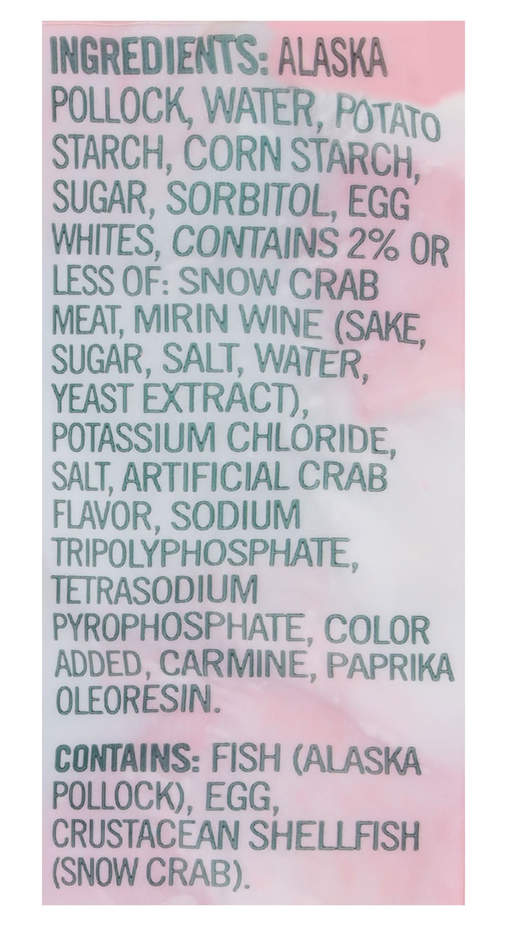 Ingredients: Alaska Pollock, Water, Potato Starch, Corn Starch, Sugar, Sorbitol, Egg Whites, Contains 2% or Less of: Snow Crab Meat, Mirin Wine (Sake, Sugar, Salt, Water, Yeast Extract), Potassium Chloride, Salt, Artificial Crab Flavor, Sodium Tripolyphosphate, Tetrasodium Pyrophosphate, Color Added, Carmine, Paprika Oleoresin Contains: Fish, Fish, Pollock, Eggs, Crustacean Shellfish, Crustacean Shellfish, Crab