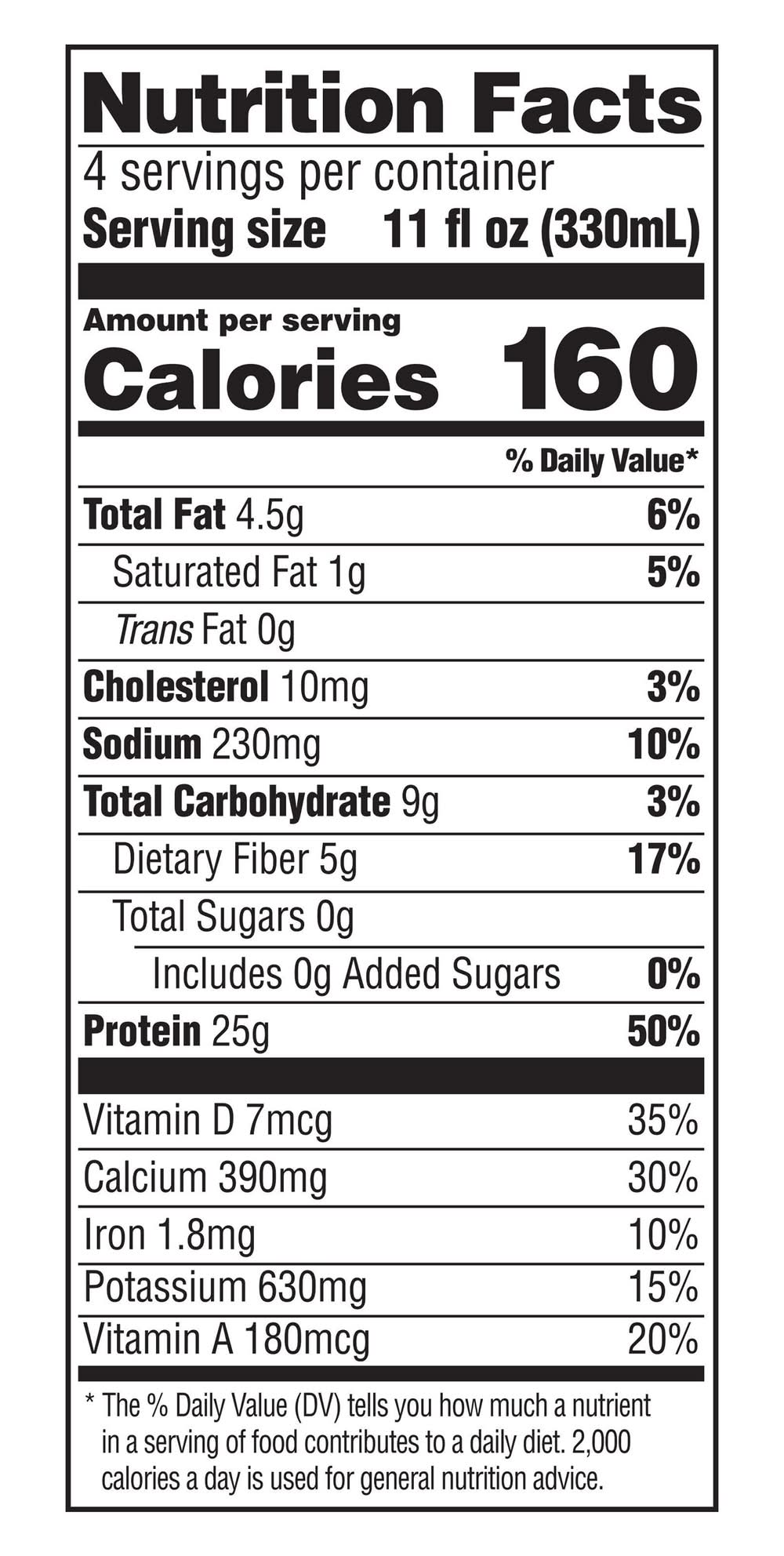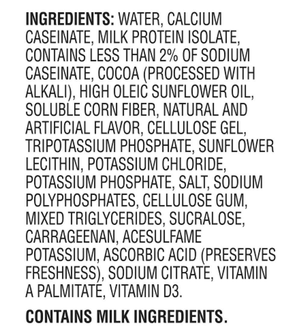 Ingredients: Water, Calcium Caseinate, Milk Protein Isolate, Contains Less than 2% of Sodium Caseinate, Cocoa (Processed with Alkali), High Oleic Sunflower Oil, Soluble Corn Fiber, Natural and Artificial Flavor, Cellulose Gel, Tripotassium Phosphate, Sunflower Lecithin, Potassium Chloride, Potassium Phosphate, Salt, Sodium Polyphosphates, Cellulose Gum, Mixed Triglycerides, Sucralose, Carrageenan, Acesulfame Potassium, Ascorbic Acid (Preserves Freshness), Sodium Citrate, Vitamin A Palmitate, Vitamin D3 Contains: Milk