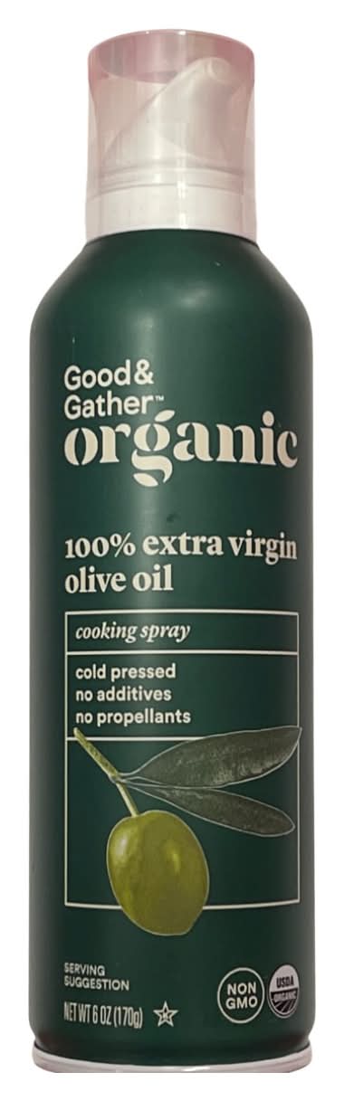Keep food from sticking to pans while adding delicious flavor when you cook with Good & Gather™ Organic Extra Virgin Olive Oil Cooking Spray. This cold-pressed olive oil is USDA Organic and Non-GMO with no additives or propellants. The convenient six-ounce size is easy to tuck inside a cupboard for frequent use, or to take outside to the grill for better flavor while reducing sticking. A great alternative to butter and margarine in your general cooking, this tasty extra virgin olive oil spray will especially complement meats, vegetables and stir frys. Every product that carries the Good & Gather™ name starts with quality ingredients that deliver great taste, making it easier for you and your family to eat well, every day. We promise you’ll love each bite, or your money back. All Good & Gather products are made without artificial flavors, synthetic colors, artificial sweeteners, and high-fructose corn syrup. Some are specially formulated while others never contained these ingredients.