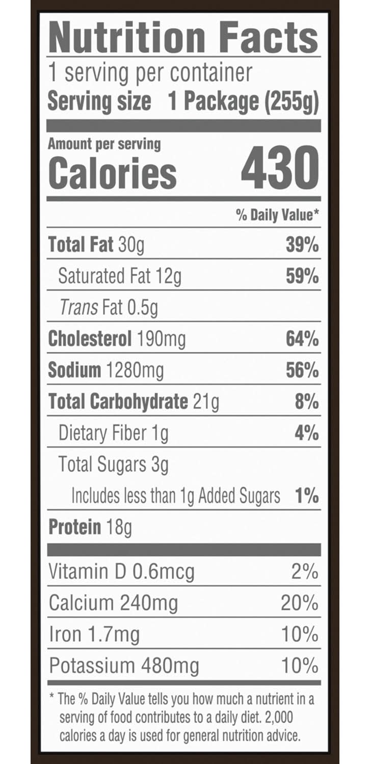 Ingredients: SAUCE, WATER, NEUFCHATEL CHEESE [MILK, CREAM, SALT, LOCUST BEAN GUM, CHEESE CULTURE], PASTEURIZED PROCESS WHITE CHEDDAR CHEESE [CHEDDAR CHEESE (CULTURED MILK, SALT, ENZYMES), WATER, SODIUM PHOSPHATE, MILKFAT, SALT], HALF AND HALF [MILK, CREAM], CORNSTARCH, GARLIC POWDER, ANNATTO EXTRACT, SEASONED SHREDDED POTATOES (POTATOES, VEGETABLE OIL BLEND [SOYBEAN AND COTTONSEED], SALT, YELLOW CORN FLOUR, DEXTROSE, SODIUM ACID PYROPHOSPHATE [TO RETAIN NATURAL COLOR], DEHYDRATED ONION, SODIUM ACID SULFATE, NATURAL FLAVOR), SCRAMBLED EGG PRODUCT, WHOLE EGGS, NON FAT MILK, SOYBEAN OIL, MODIFIED CORNSTARCH, SALT, XANTHAN GUM, CITRIC ACID, BUTTER FLAVOR [CORN MALTODEXTRIN, BUTTER FLAVOR, ANNATTO (COLOR), TURMERIC], WHITE PEPPER, SHREDDED PART-SKIM MOZZARELLA CHEESE (PASTEURIZED PART-SKIM MILK, SKIM MILK, SALT, CHEESE CULTURE, ENZYMES), COOKED SMOKED SAUSAGE, SMOKE FLAVORING ADDED (PORK, BEEF, WATER, SALT, CONTAINS 2% OR LESS OF CORN SYRUP SOLIDS, FLAVORING [CONTAINS MUSTARD], DEXTROSE, SODIUM PHOSPHATES, SMOKE FLAVORING, SODIUM ERYTHORBATE, SODIUM NITRITE), COOKED SAUSAGE CRUMBLES (PORK, WATER, SALT, SPICES, CORN SYRUP SOLIDS, DEXTROSE, SPICE EXTRACTIVE), FULLY COOKED APPLEWOOD SMOKED BACON PIECES ( BACON [CURED WITH WATER, SALT, SUGAR, SODIUM NITRITE], APPLEWOOD SMOKE FLAVOR. MAY CONTAIN SODIUM PHOSPHATE, SMOKE FLAVOR, SODIUM ERYTHORBATE, SODIUM ASCORBATE, DEXTROSE), . Contains: CONTAINS: EGG, MILK.