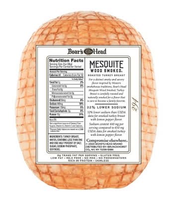 Similar to Western Smokehouse traditions, Boar’s Head® Mesquite Wood Smoked Turkey Breast is masterfully seasoned for a distinctly smoky and savory taste. It is then carefully slow roasted to lock in all the flavors. This smoky savory turkey is sure to become a family favorite. It is a heart-healthy product that qualifies for the American Heart Association Heart-Check program.