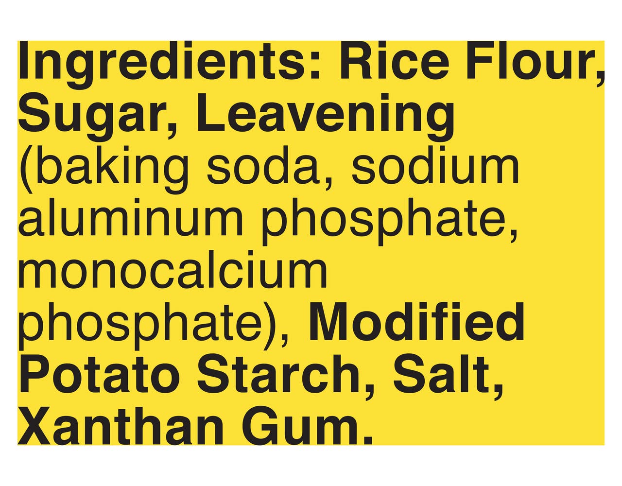 Ingredients: Rice Flour, Sugar, Leavening (Baking Soda, Sodium Aluminum Phosphate, Monocalcium Phosphate), Modified Potato Starch, Salt, Xanthan Gum