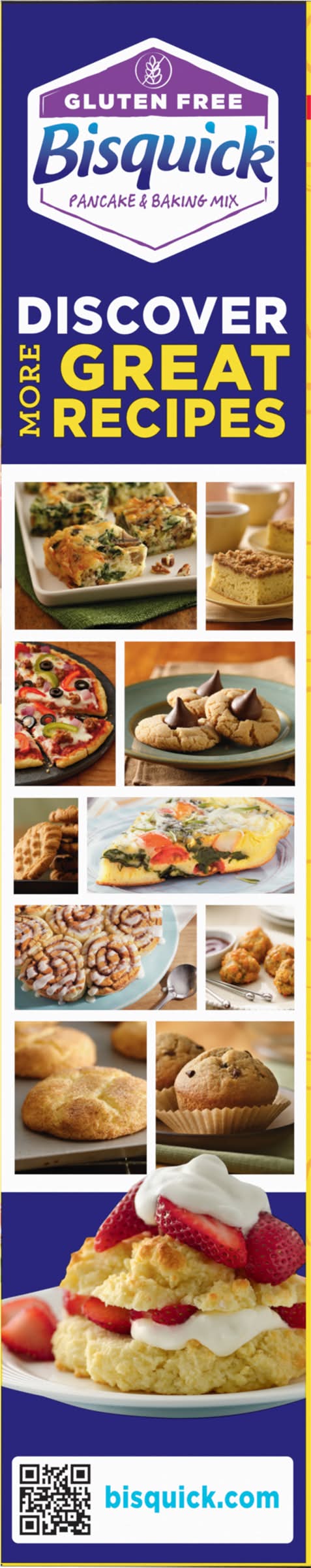 Directions: to measure bisquick gluten free mix: spoon into dry-ingredient measuring cup; level with knife. gluten free pancakes: makes 10 pancakes. 1 cup gluten free bisquick mix. 1 cup milk. 2 tbsp vegetable oil. 1 egg. 1. stir ingredients until blended. 2. pour slightly less than 1/4 cupfuls onto hot greased griddle. 3. cook until edges are dry. turn; cook until golden. high altitude (3500-6500 ft): no change. gluten free waffles: makes 8 (4-inch) waffles: 1-1/3 cups gluten free bisquick mix 1-1/4 cups milk. 3 tbsp vegetable oil. 1 egg. 1. stir ingredients until blended. 2. pour onto center of hot greased waffle maker; close lid 3. bake about 5 min or until steaming stops. carefully remove waffle. high altitude (3500-6500 ft): no change. gluten free biscuits: makes 10 biscuits: 2 cups gluten free bisquick mix. 1/3 cup shortening. 2/3 cup milk. 3 eggs 1. heat oven to 400 degrees f. 2. cut shortening into mix, using fork, until particles are size of small peas. stir in remaining ingredients until soft dough forms. 3. drop by spoonfuls onto ungreased cookie sheet. 4. bake 13-16 min or until golden brown. high altitude (3500-6500 ft): no change. gluten free strawberry shortcakes: makes 6 shortcakes. 4 cups (1 quart) strawberries, sliced. 1/2 cup sugar. 2-1/3 cups gluten free bisquick mix. 1/3 cup butter. 3/4 cup milk. 3 eggs, neaten. 1/2 teaspoon pure vanilla extract. 3/4 cup whipping cream, whipped. 1. in small bowl, mix strawberries and 1/4 cup sugar, set aside. 2. heat oven to 425 degrees. grease cookie sheet. in medium bowl, combine bisquick mix and remaining 1/4 cup of the sugar, cut in butter with pastry blender or fork. stir in milk, eggs and vanilla. 3. drop by6 spoonfuls onto cookie sheet. 4. bake 10 to 12 minutes or until light golden brown. cool 5 minutes. with serrated knife, split shortcakes; fill and top with strawberries and whipped cream. to open lift this tab.