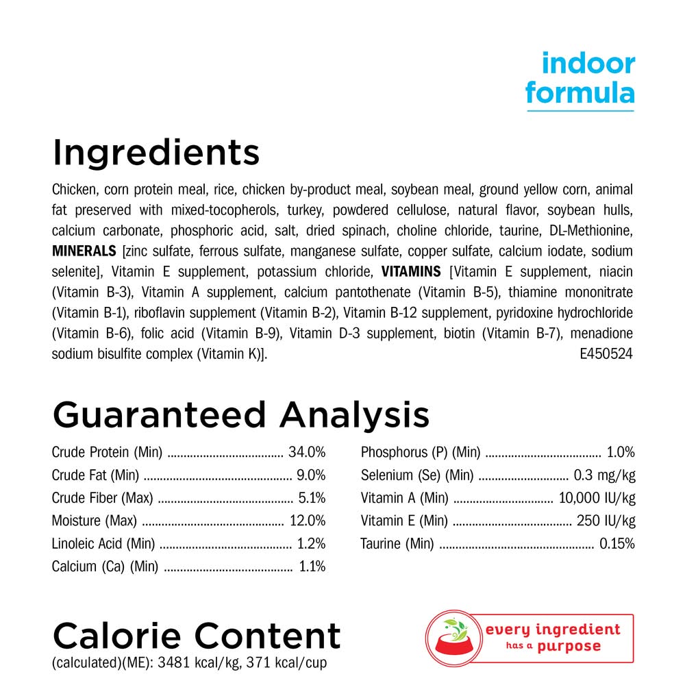 your indoor cat and provide her with a delicious mealtime option packed with natural nutrition designed to meet her unique needs. To give you added peace of mind every time you fill her dish. Natural fiber in every serving of this Naturals cat food helps to control hairballs, and the special formulation helps promote her healthy weight. Watch as she comes running when she hears the sound of the cat kibble hitting her dish and rest easy knowing she's getting an indoor dry food for cats that contains all 25 essential vitamins and minerals. She gets a natural cat food taste and texture to satisfy her taste buds, and you get the comfort that comes from giving your cat companion a premium meal to help support her healthy, happy life with you. Nestle Purina PetCare Company, St. Louis, MO, 63164