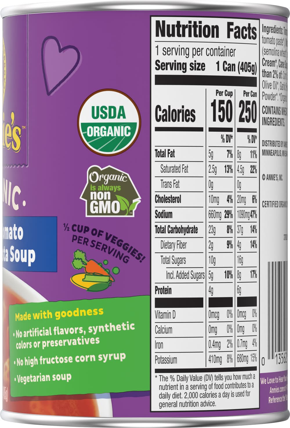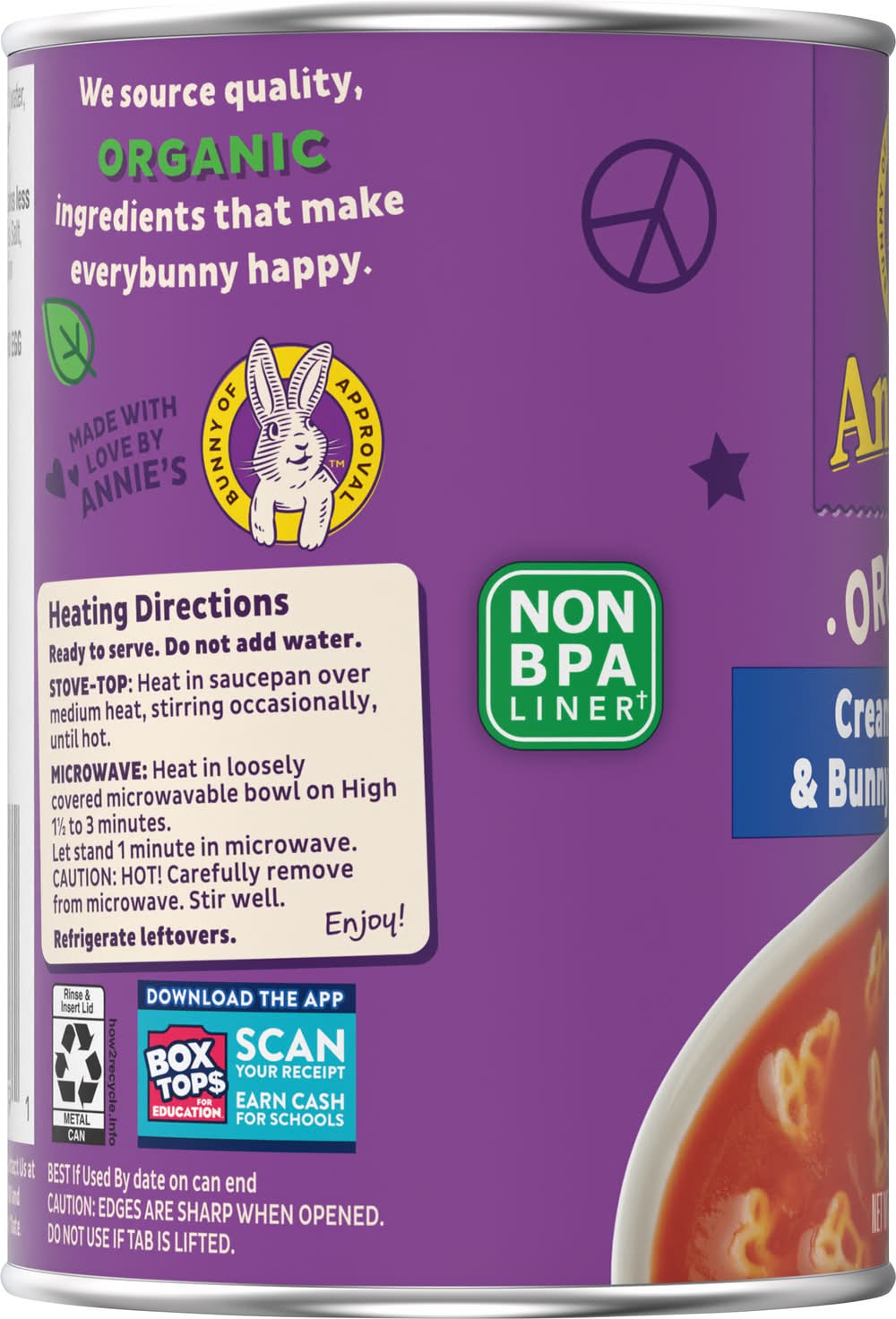 Organic Creamy Tomato & Bunny Pasta Soup • Number of servings: 2 • Annie's, Berkeley, CA, 94710, Ph: 800-288-1089 • Packaging: Reusable