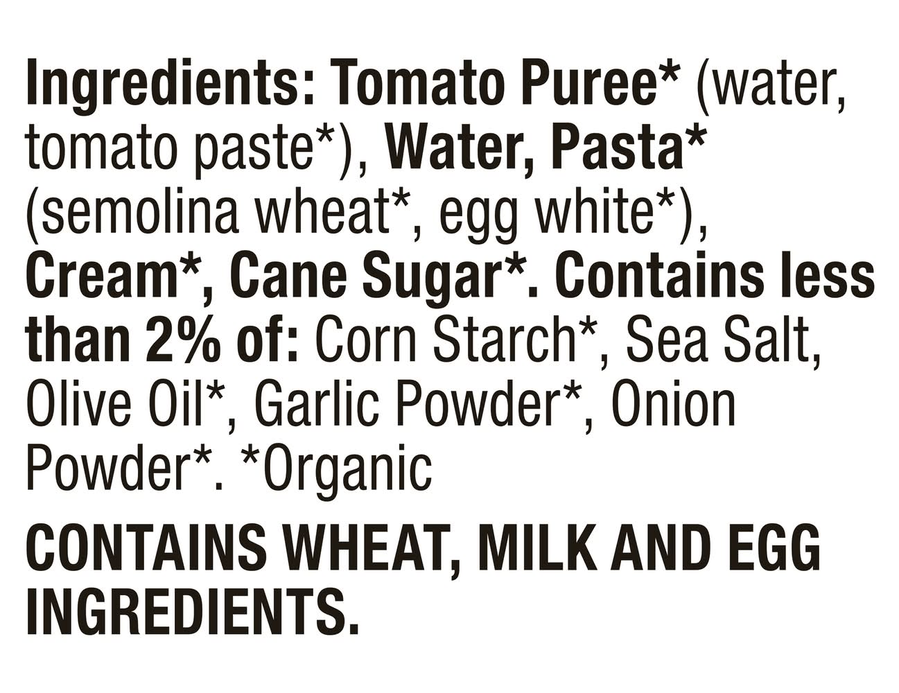 Ingredients: Tomato Puree* (Water, Tomato Paste*), Water, Pasta* (Semolina Wheat, Egg White*), Cream*, Cane Sugar*.Contains Less than 2% of: Corn Starch*, Sea Salt, Olive Oil*, Garlic Powder*, Onion Powder*. * Organic Contains: Milk, Wheat, Eggs, Corn
