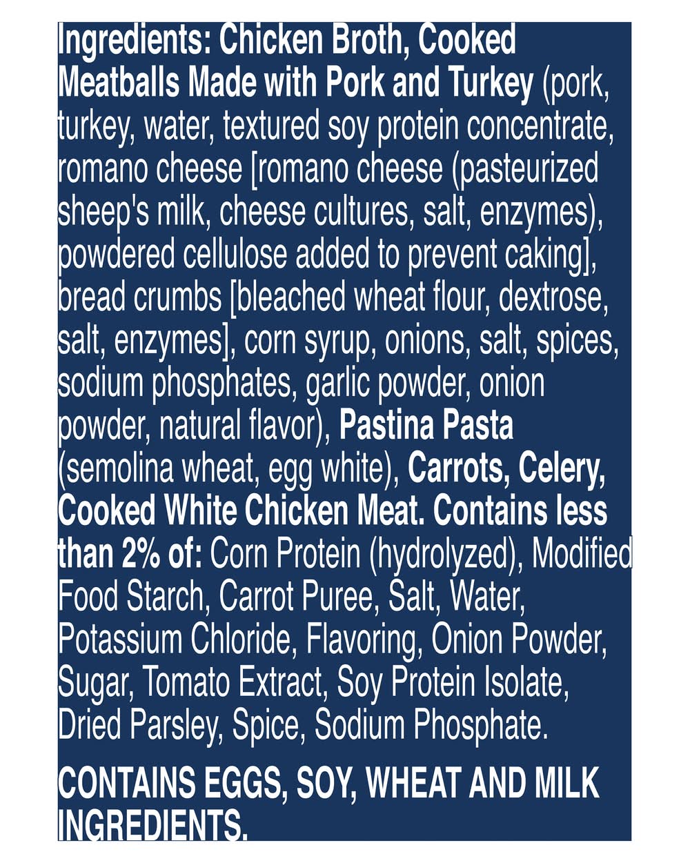 Ingredients: Chicken Broth, Cooked Meatballs Made with Pork and Turkey (Pork, Turkey, Water, Textured Soy Protein Concentrate, Romano Cheese [Romano Cheese (Pasteurized Sheep's Milk, Cheese Cultures, Salt, Enzymes), Powdered Cellulose Added to Prevent Caking], Bread Crumbs [Bleached Wheat Flour, Dextrose, Salt, Enzymes], Corn Syrup, Onions, Salt, Spices, Sodium Phosphates, Garlic Powder, Onion Powder, Natural Flavor), Pastina Pasta (Semolina Wheat, Egg White), Carrots, Celery, Cooked White Chicken Meat, Contains Less than 2% of: Corn Protein (Hydrolyzed), Modified Food Starch, Carrot Puree, Salt, Water, Potassium Chloride, Flavoring, Onion Powder, Sugar, Tomato Extract, Soy Protein Isolate, Dried Parsley, Spice, Sodium Phosphate Contains: Soybeans, Milk, Wheat, Celery, Eggs