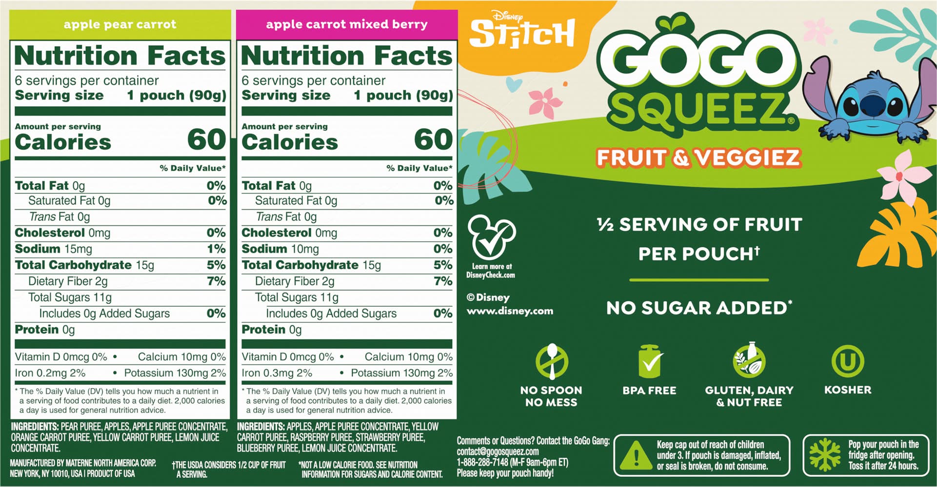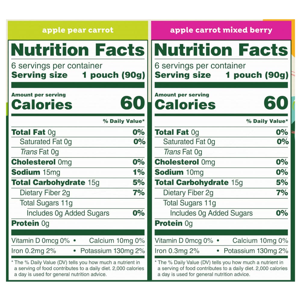 Ingredients: Apple Pear Carrot: Pear Puree, Apples, Apple Puree Concentrate, Orange Carrot Puree, Yellow Carrot Puree, Lemon Juice Concentrate. Apple Carrot Mixed Berry: Apples, Apple Puree Concentrate, Yellow Carrot Puree, Raspberry Puree, Strawberry Puree, Blueberry Puree, Lemon Juice Concentrate.