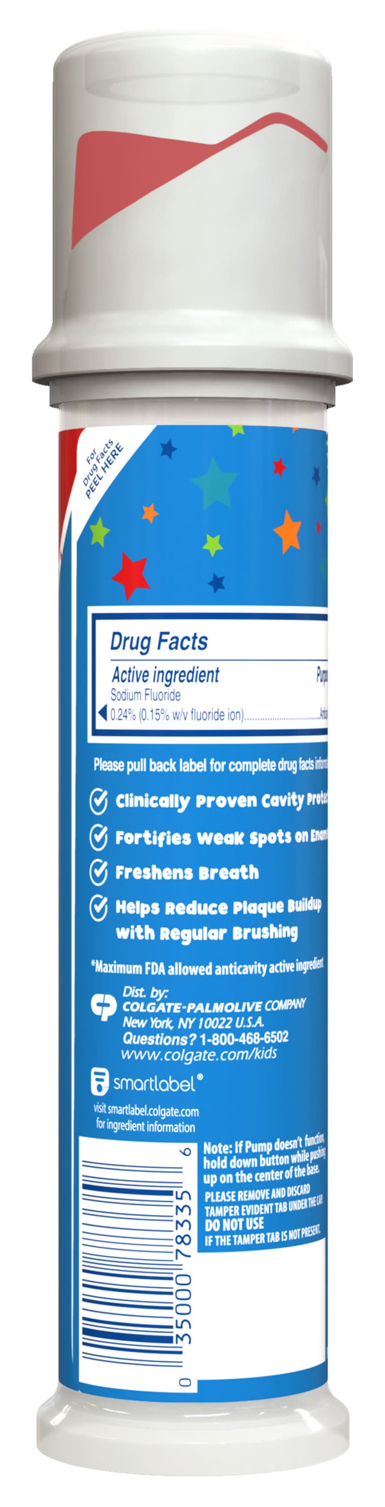 Directions: note: if pump doesn't function, hold down button while pushing up on the center of the base. adults and children 2 years of age and older: brush teeth thoroughly, preferably after each meal or at least twice a day, or as directed by a dentist or physician. please remove and discard tamper evident tab under the cap. children 2 to 6 years: use only a pea sized amount and supervise child's brushing and rinsing (to minimize swallowing). children under 2 years: ask a dentist or physician.