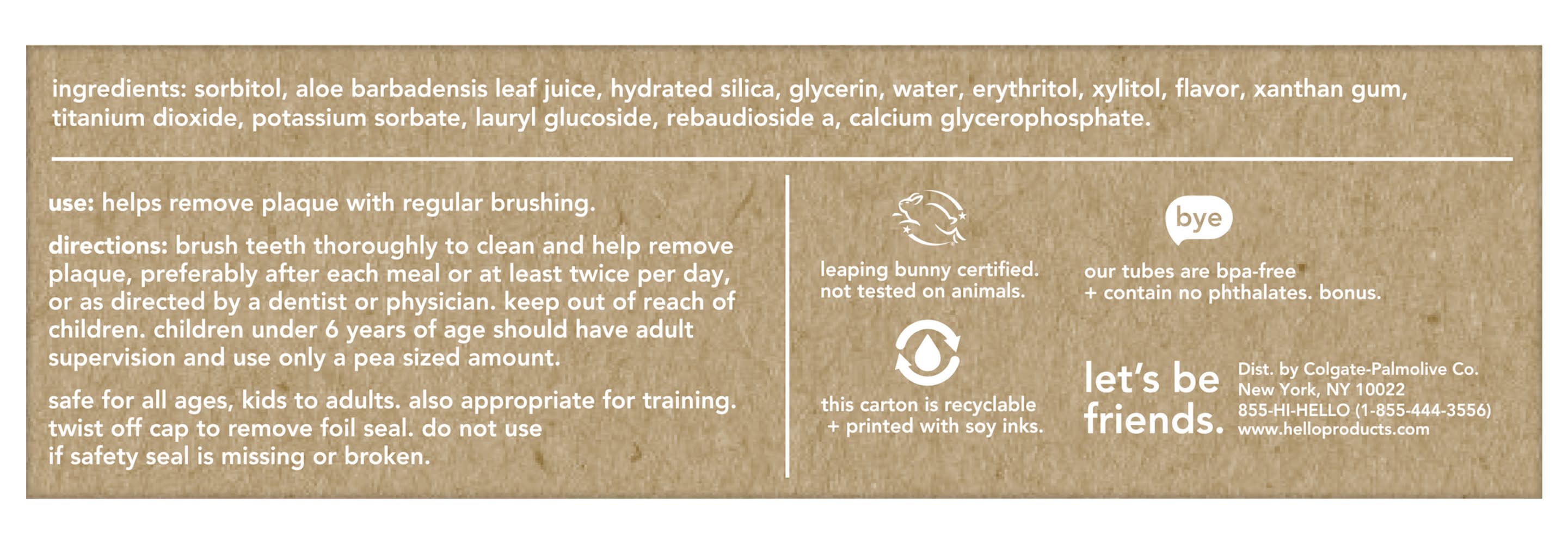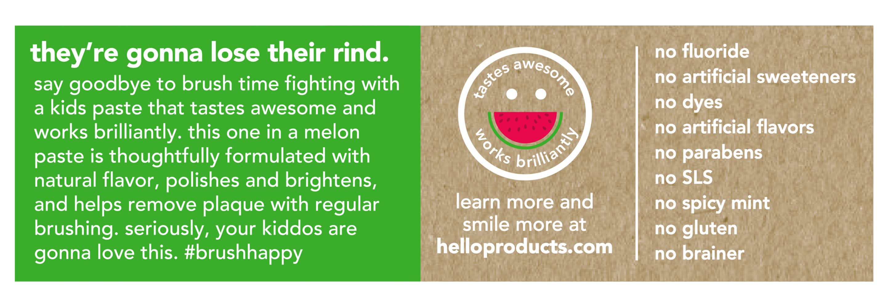 say goodbye to brush time fighting with a kids paste that tastes awesome and works brilliantly. this one in a melon paste is thoughtfully formulated with natural flavor, polishes and brightens, and helps remove plaque with regular brushing. seriously, your kiddos are gonna love this. #brushhappy • Hello Products Llc, Montclair,NJ,07042 • Packaging: Reusable