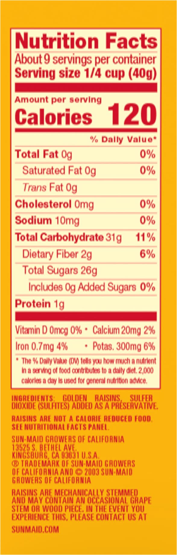 Ingredients: Golden Raisins, Sulfur Dioxide (Sulfites) Added as a Preservative