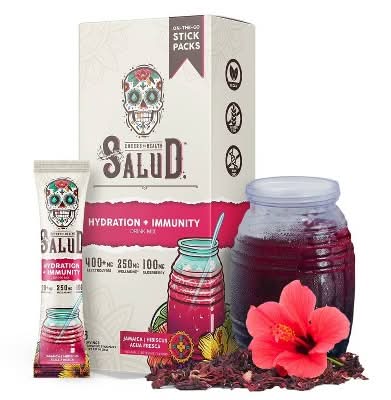 Salud Hydration + Immunity Drink Mix is the go-to for whenever you’re feeling dehydrated and need to refuel. Not only does each packet contain Electrolytes and Coconut Water to support hydration, but we’ve also included Elderberry and Wellmune to improve immune health. • Flavor: Jamaica hibiscus • Pack size: 6